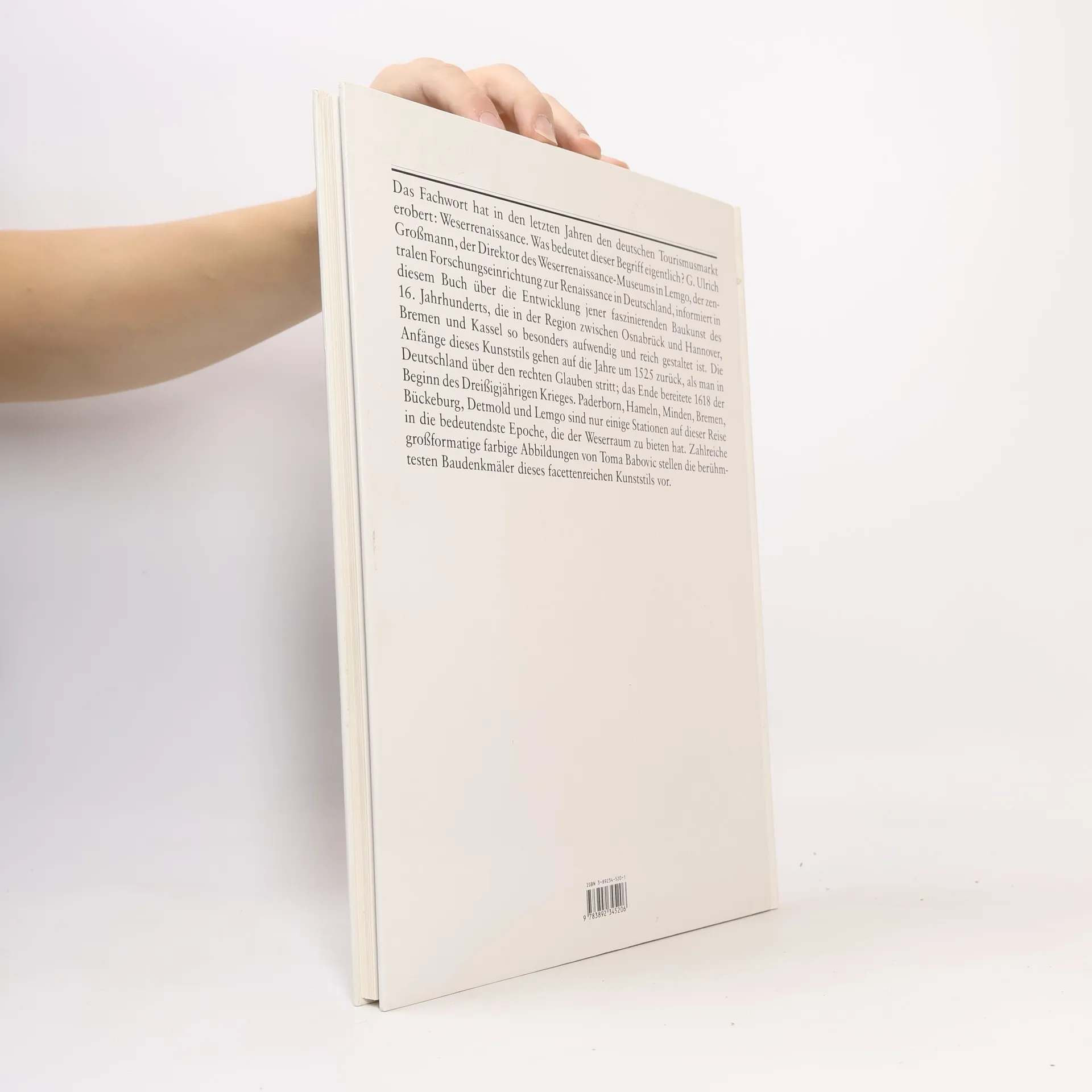 Ein Fachwort hat in den letzten Jahren den deutschen Tourismusmarkt erobert: Weserrenaissance. Eine Straße zur Weserrenaissance besteht seit 1989, nun kommen Radwege hinzu. Aber was bedeutet dieser Begriff? Der ehemalige Direktor des Weserrenaissance-Museums in Lemgo informiert über die Entwicklung der faszinierenden Baukunst des 16. Jahrhunderts, die in der Region zwischen Osnabrück und Hannover, Bremen und Kassel besonders aufwendig gestaltet ist. Charakteristische Giebel, malerische Türme, eindrucksvoll ausgestattete Säle und verspielte Kirchen sind typisch für diese wirtschaftlich und politisch bedeutende Region an der Weser. Die Anfänge dieses Kunststils gehen auf die Jahre um 1525 zurück, als in Deutschland über den rechten Glauben gestritten wurde; das Ende bereitete 1618 der Beginn des Dreißigjährigen Krieges. Dazwischen lag eine Blütezeit der Kunst, Baukunst und Buchkunst. Bücher und gedruckte Bilder verbreiteten das Wissen von der Antike und der Renaissance in dieser Region. Paderborn, Hameln, Minden, Bremen, Bückeburg, Detmold und Lemgo mit seinem Weserrenaissance-Museum sind nur einige Stationen auf dieser Reise in die bedeutendste Epoche des Weserraums. Zahlreiche großformatige und farbige Abbildungen stellen die berühmtesten Baudenkmäler dieses facettenreichen Kunststils vor.