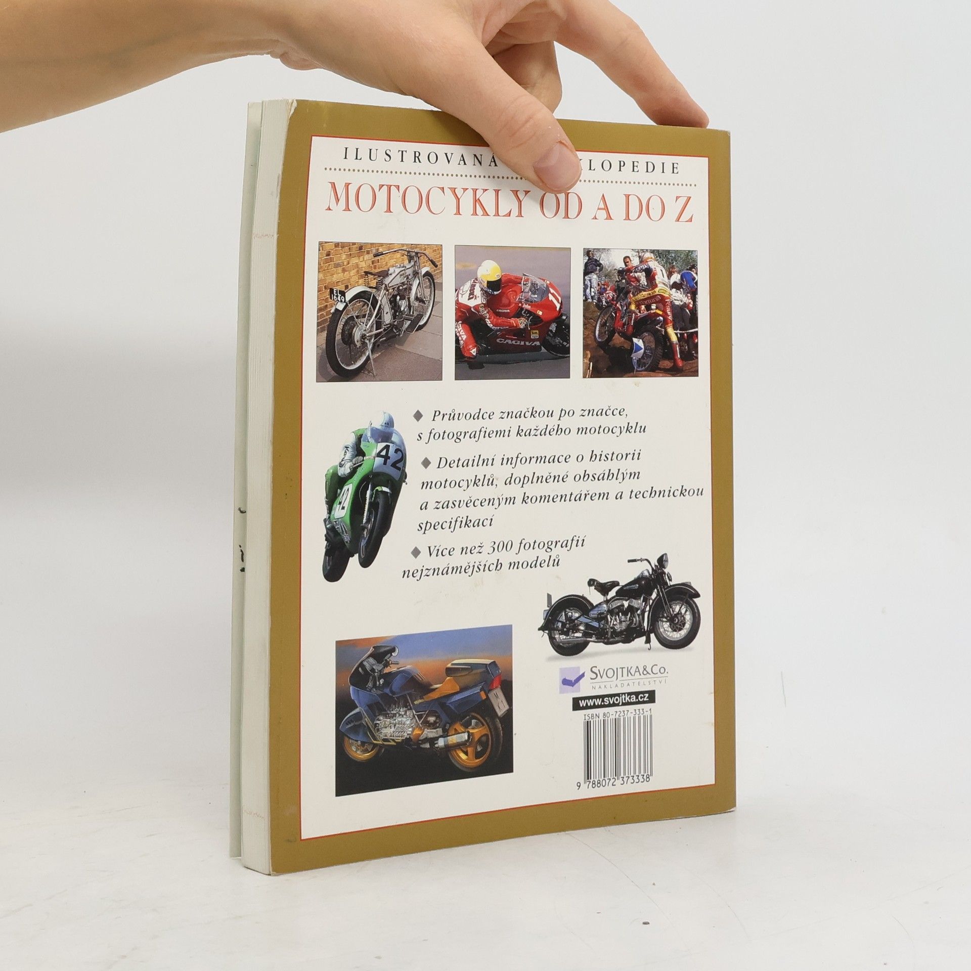 . Průvodce hlavními výrobci, značkou po značce, s fotografiemi každého motocyklu . Detailní informace o historii motocyklů, doplněné obsáhlým a zasvěceným komentářem a technickou specifikací . Více než 300 barevných fotografií nejznámějších modelů