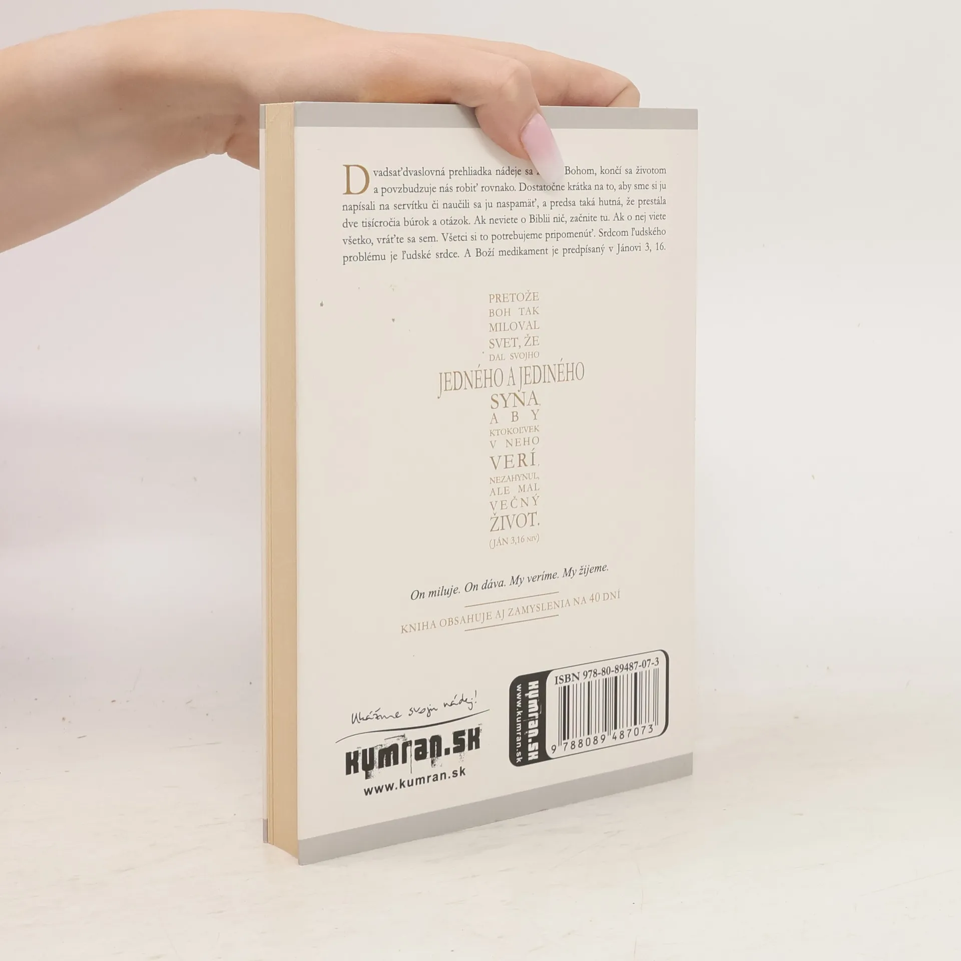 Neboť Bůh tak miloval svět, že dal svého jediného Syna, aby žádný, kdo v něho věří, nezahynul, ale měl život věčný. Jan, 3.16 Dvadsaťdvaslovná prehliadka nádeje sa začína Bohom, končí sa životom a povzbudzuje nás robiť rovnako. Dostatočne krátka na to, aby sme si ju napísali na servítku či naučili sa ju naspamäť, a predsa taká hutná, že prestála dve tisícročia búrok a otázok. Ak neviete o Biblii nič, začnite tu. Ak o nej viete všetko, vráťte sa sem. Všetci to potrebujeme pripomenúť. Srdcom ľudského problému je ľudské srdce. A Boží medikament je predpísaný v Jánovi 3, 16.
