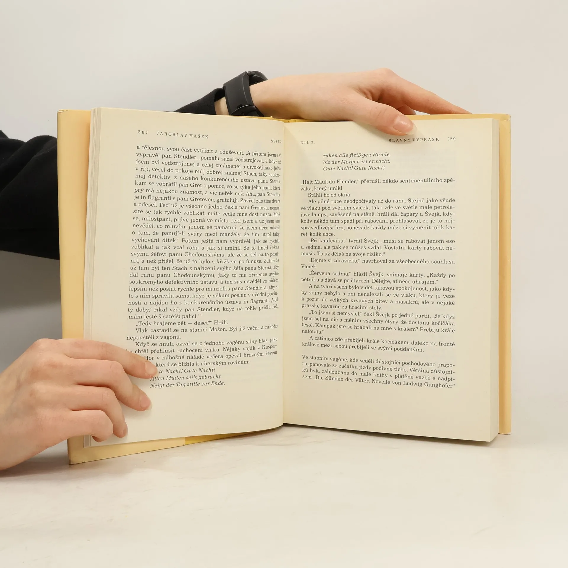 Slavný výprask - 91. pěší pluk je opět naložen do vlaku, který jej veze jako „novou skupinu lidí hnaných na jatky“ do Haliče na ruskou frontu. Hašek tuto pouť přes celé Uhry popisuje tak, že se román stává skutečnou obžalobou války a stupidních důstojníků, kterým nejde o nic jiného než o vlastní prospěch bez ohledu na osudy vojáků, kterým mají velet. Jejich schopnosti Hašek popisuje takto: „Byl to pán velkých vojenských schopností, které se mu vrazily do nohou ve formě podágry“. Názory prostých vojáků na válku charakterizuje Hašek slovy: „Po celou dobu železniční přepravy bataliónu, který měl sklízet válečnou slávu, až projde pěšky od Laborce východní Haličí na front, vedly se ve vagónu, kde byl jednoroční dobrovolník a Švejk, opět podivné řeči, víceméně velezrádného obsahu“. Na konci dílu je Švejk vyslán jako kvartýrmachr zajistit pro svou kumpanii nocleh ve Felštýně. Když Švejk dojde k malému rybníku, setká se tam s uprchlým ruským zajatcem, který se tam koupal a po spatření Švejka se dal nahý na útěk. Švejk si oblékne jeho uniformu, protože je zvědav, jak by mu asi slušela. V této uniformě ho najde patrola polního četnictva, která tohoto ruského uprchlíka hledala. Jsou to Maďaři, kteří Švejkovi nerozumí a přes jeho protesty ho zařadí do transportu ruských zajatců určených pracovat na opravě železniční trati. Tak Švejk upadne omylem do rakouského zajetí. Pokračování slavného výprasku - Poté, co je zjištěno, že Švejk je Čech, je na něj pohlíženo jako na zběha a polní soud ho odsoudí k smrti. Duchovní útěchu před popravou mu má poskytnout polní kurát Martinec, původně skutečně nábožensky založený muž, který stykem s opilými důstojníky postupně mravně upadá, což si nepřestává v skrytu duše neustále vyčítat. Švejk jej však považuje za dalšího vězně a svými proslovy jej tak vyděsí, že Martinec z cely prchne na důstojnický večírek, kde se zpije do bezvědomí „s přesvědčením, že se hraje o jeho duši a on sám že je mučedníkem“. Nakonec se vše vysvětlí a Švejk se opět ocitne u své marškumpanie. Haškův text pak končí proslovem poručíka Duba „S okresním hejtmanem jsme vždy říkávali: Patriotismus, věrnost k povinnosti, sebepřekonání, to jsou ty pravé zbraně ve válce! Připomínám si to zejména dnes, když naše vojska v dohledné době překročí hranice“. Vše, co případně v knize následuje za touto větou, je pokračování dopsané od Karla Vaňka.