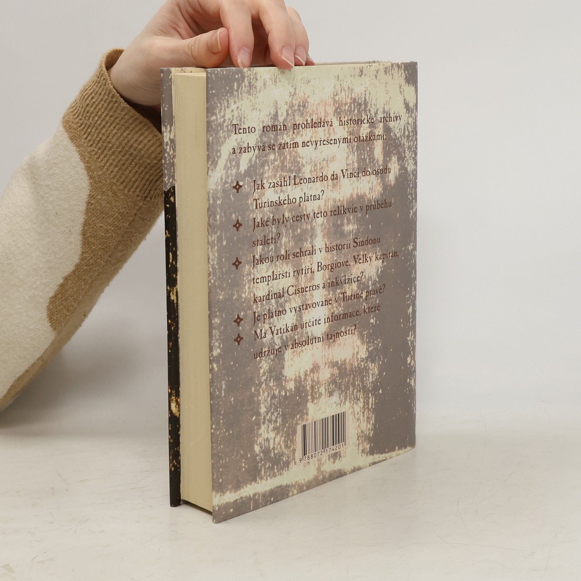 Napínavý román, odhalující spojitost mezi Leonardem da Vinci a Turínským plátnem - nejznepokojivější relikvií křesťanství, je považován za španělský "Da Vinciho kód". Ve Španělsku měl obrovský úspěch a je přeložen do sedmi jazyků. Jeruzalém za Ježíše Krista, Konstantinopol křížových výprav, Leonardova Florencie, osvícenecká Paříž, současný Madrid, cisterciácký a skrytě templářský klášter Poblet - to jsou kuliy vzrušujíhího vyprávění, mistrně spoujícího historická fakta s fikcí, jež předkládá důvtipné a logické řešení věčného sporu o pravost posvátného roucha.