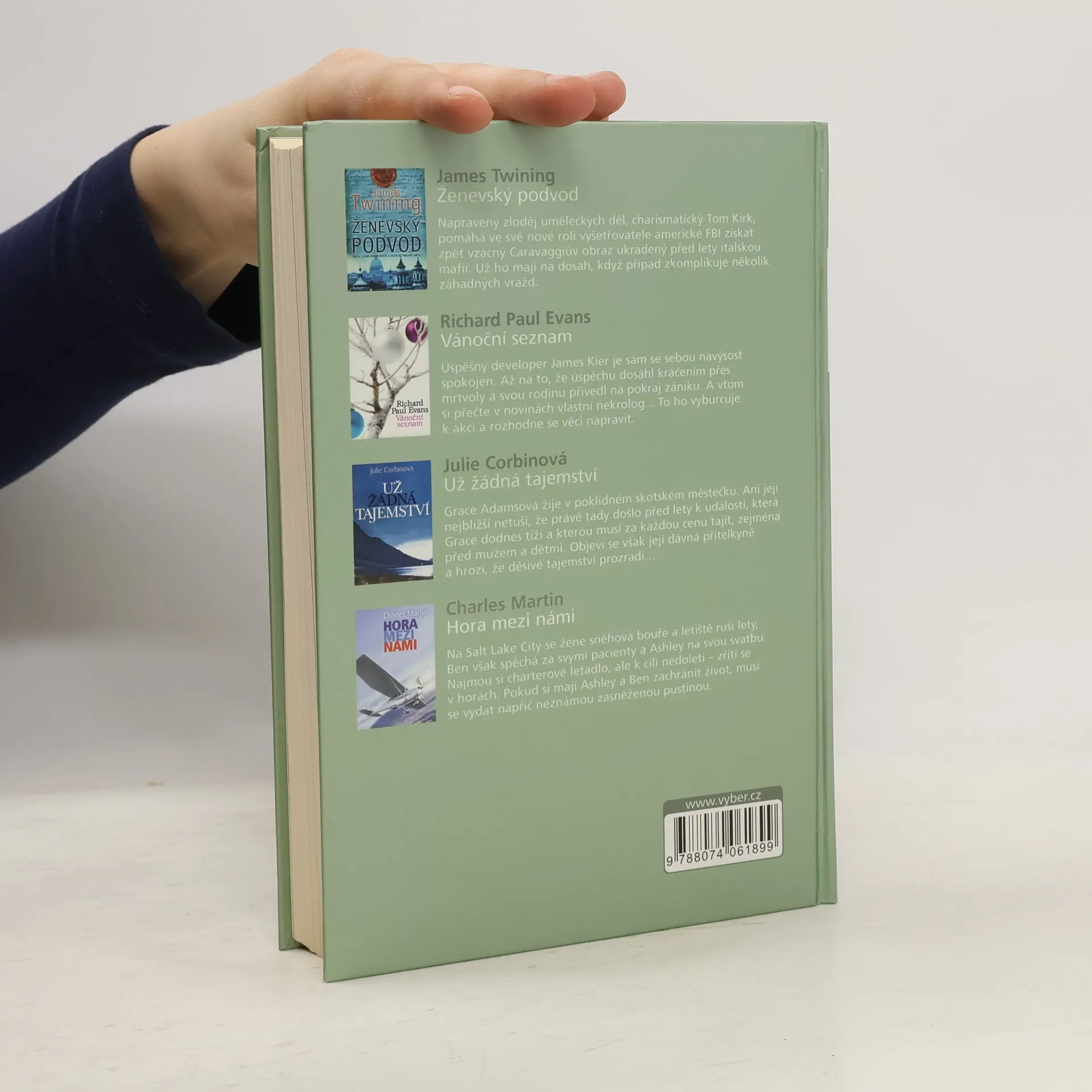 1) James Twining: Ženevský podvod - Napravený zloděj uměleckých děl, charismatický Tom Kirk, pomáhá ve své nové roli vyšetřovatele americké FBI získat zpět vzácný Caravaggiův obraz ukradený před lety italskou mafií. Už ho mají na dosah, když případ zkomplikuje několik záhadných vražd. 2) Richard Paul Evans: Vánoční seznam - Úspěšný developer James Kier je sám se sebou navýsost spokojen. Až na to, že úspěchu dosáhl kráčením přes mrtvoly a svou rodinu přivedl na pokraj zániku. A vtom si přečte v novinách vlastní nekrolog... To ho vyburcuje k akci a rozhodne se věci napravit. 3) Julie Corbinová: Už žádná tajemství - Grace Adamsová žije v poklidném skotském městečku. Ani její nejbližší netuší, že právě tady došlo před lety k události, která Grace dodnes tíží a kterou musí za každou cenu tajit, zejména před mužem a dětmi. Objeví se však její dávná přítelkyně a hrozí, že děsivé tajemství prozradí… 4) Charles Martin: Hora mezi námi - Na Salt Lake City se žene sněhová bouře a letiště ruší lety, Ben však spěchá za pacienty a Ashley na svou svatbu. Najmou si malé letadlo, ale k cíli nedoletí – zřítí se v horách. Pokud si mají Ashley a Ben zachránit život, musí se vydat napříč neznámou zasněženou pustinou.