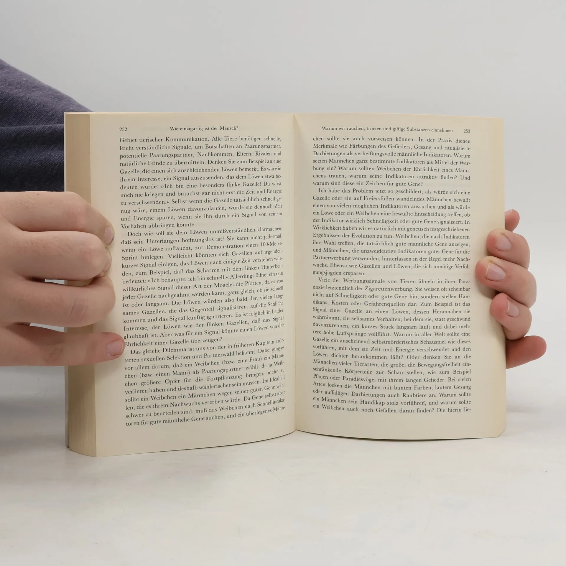 Der Mensch als Spezies hat sich in seiner relativ kurzen Geschichte die Erde untertan gemacht. Was hat ihn vor rund 40 000 Jahren zu diesem großen Sprung nach vorn befähigt und ihn von seinen nächsten Verwandten im Tierreich, den Schimpansen, so weit entfernt, im Guten wie im Bösen? Offensichtlich sein besonders funktionierendes Gehirn und seine Sprache, die einen besonders geformten Sprechapparat voraussetzt. Doch der Mensch ist deswegen noch kein höheres Wesen, das der allgemeinen Lebensevolution entlaufen wäre, sondern er ist weiterhin mit seinem tierischen Erbe verbunden. Diese evolutionären Bindungen weist der Autor, 'der beste auf dem Gebiet der Evolutionsbiologie' (Edward O. Wilson), in großer Detailfülle nach, und er tut dies auf so spannende und unterhaltsame Weise, daß der immense Wissensstoff leicht „verdaulich“ wie ein guter Kriminalroman ist - wie ein Kriminalroman auch deswegen, weil der Autor die Schattenseiten menschlicher Existenz, vom Völkermord bis zur Umweltzerstörung, nicht ausspart.