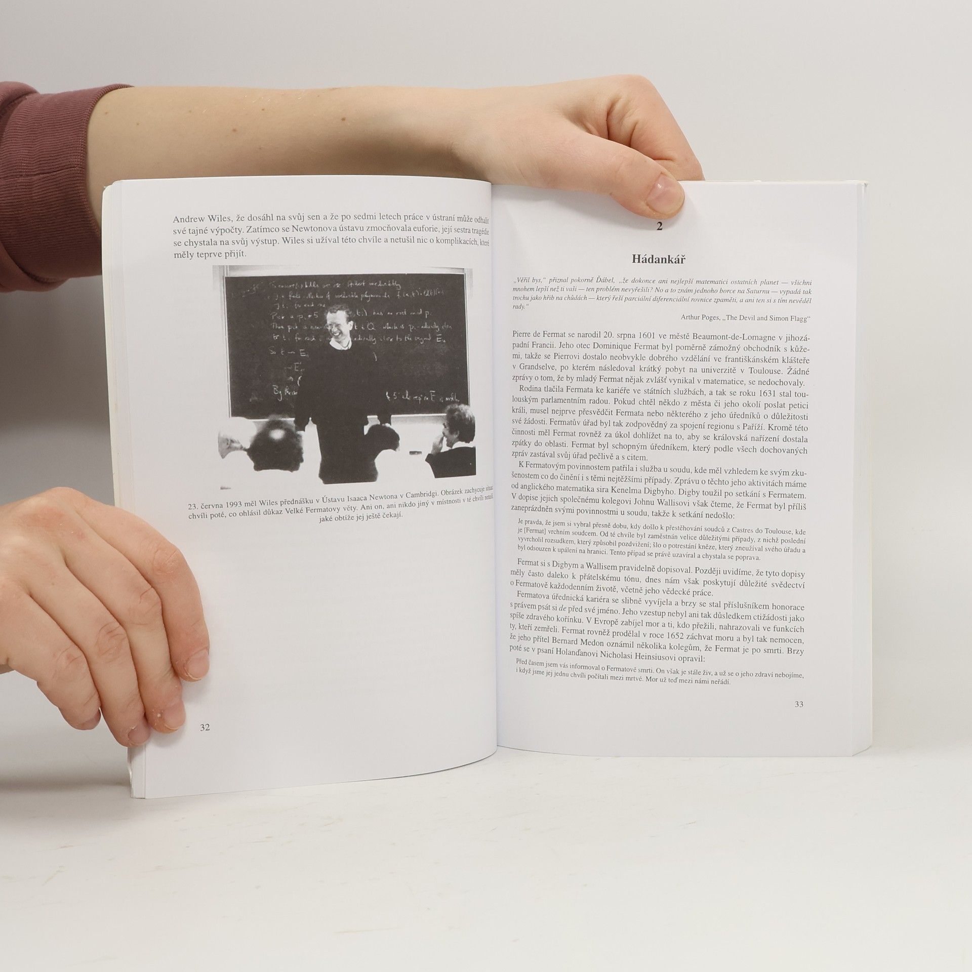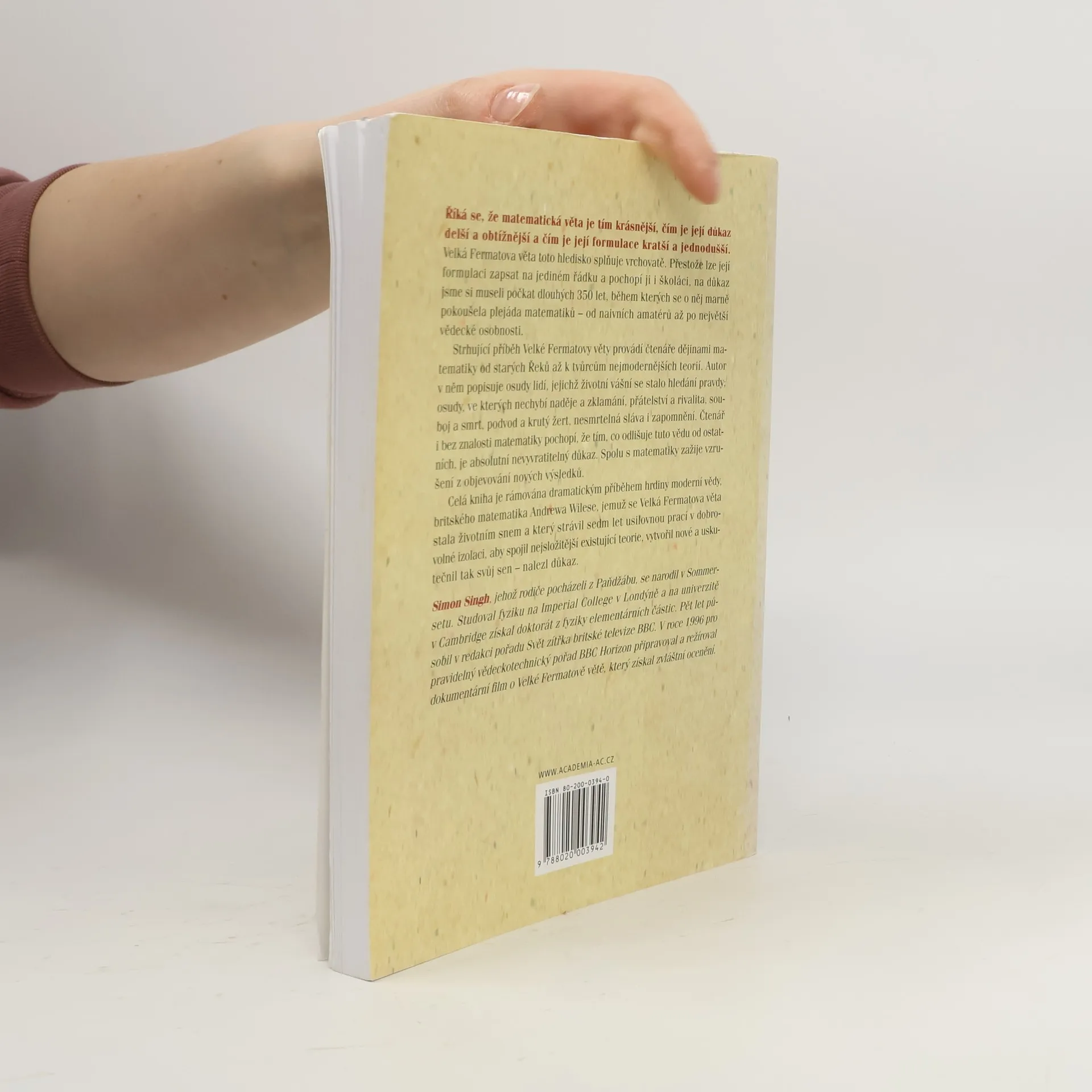Podtitul: Dramatická historie řešení největšího matematického problému Kniha líčí téměř 350 let úsilí matematiků celého světa o nalezení důkazu Velké Fermatovy věty, kterou vyslovil francouzský matematik 17. stol. Pierre de Fermat. Na okraji překladu Diofantovy Aritmetiky si poznamenal, že rovnice x n + y n = z n nemá řešení v množině přirozených čísel (N) pro n větší než 2 a že zná důkaz tohoto tvrzení, ale nevešel by se mu na okraj knihy. Kniha je strhujícím vyprávěním o příběhu této věty, který se prolíná celými dějinami matematiky a dotýká se všech oblastí teorie čísel. Sama věta není důležitá pro matematiku ani její aplikace. Ale matematikové jsou podobni horolezcům, kteří zdolávají horské velikány, prostě protože jsou. Fermatovu větu „zdolal“ až britský matematik Andrew Wiles v roce 1994.