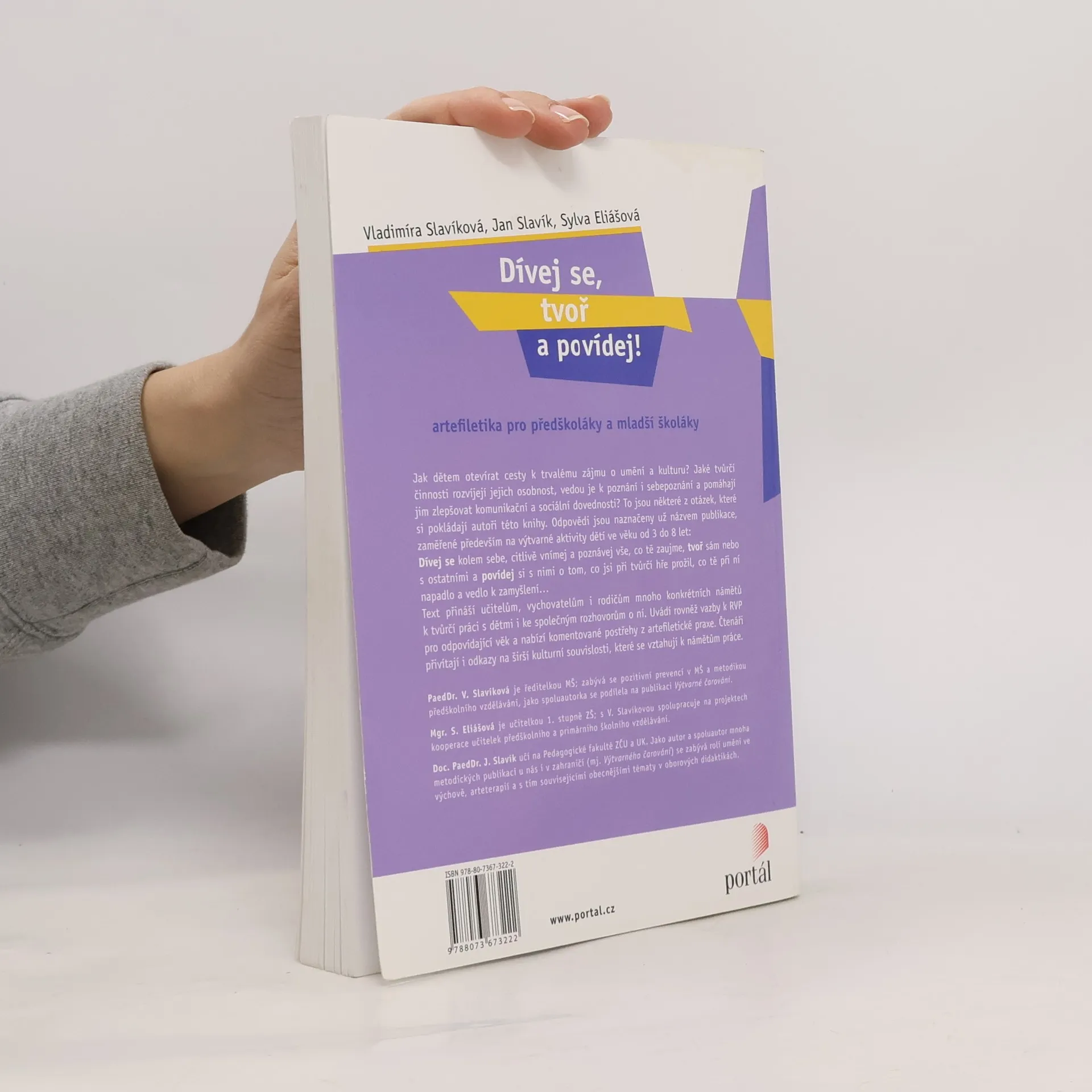 Příručka pro práci s dětmi ve věku 3 až 8 let, která se zaměřuje na výtvarné aktivity. Autoři vycházejí z přesvědčení, že školní estetická výchova by se neměla jednostranně zabývat vzděláváním, ale mnohem více než doposud podpořit emocionální a socializační složku výchovy. K tomu napomáhá tzv. skupinový reflektivní dialog, který podporuje schopnost dětí přemýšlet o tom, co a proč tvoří, srovnávat vlastní výtvory s díly spolužáků, vyjadřovat své estetické názory atd. Takto vedené dítě pak nevnímá výtvarnou či hudební výchovu jako vyučovací předmět, ale umění se mu může postupně stát životní potřebou. Knížka je určena učitelkám MŠ, pedagogům 1. st. ZŠ a rodičům.Mgr. Vladimíra Slavíková je ředitelkou MŠ, je spoluautorkou publikace Výtvarné čarování. Mgr. Sylva Eliášová je učitelkou 1. stupně ZŠ, s Vladimírou Slavíkovou spolupracuje na projektech kooperace učitelek předškolního a primárního školního vzdělávání.Doc. Jan Slavík učí na Pedagogické fakultě UK. Jako autor a spoluautor mnoha publikací se zabývá oblastí všeobecného vzdělávání, především se zaměřením na umění ve výchově a na arteterapii.