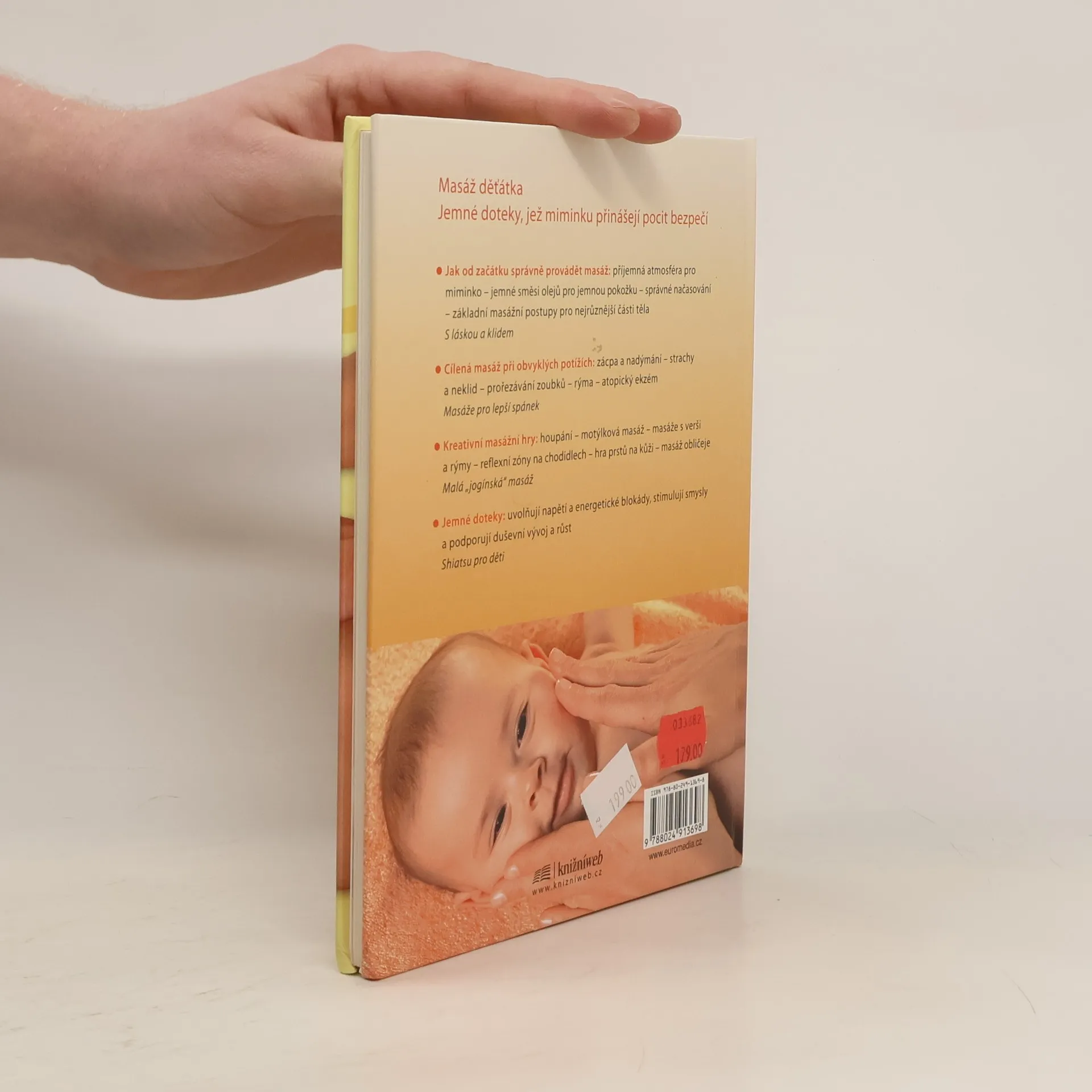 Jemné doteky přinášejí miminku pocit lásky a bezpečí. Rodiče se naučí krok za krokem provádět masáž kojenců a batolat v příjemné atmosféře domova. Zvládnou masážní postupy pro nejrůznější části těla. Zvolí cílenou masáž při potížích, jako je zácpa, nadýmání, neklid, prořezávání zoubků, rýma či atopický ekzém. Kreativní masážní hry pomáhají navázat láskyplný vztah. A jako bonus – shiatsu: jemné doteky, které uvolňují napětí a podporují duševní vývoj a růst miminka