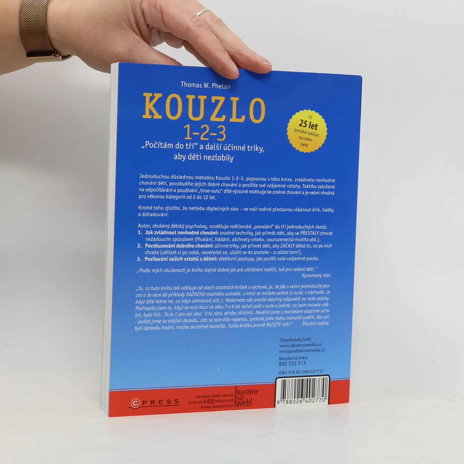 Jednoduchou důslednou metodou zvládnete nevhodné chování dětí, povzbudíte jejich dobré chování a posílíte vzájemné vztahy. Samotné „kouzlo 1-2-3“ je taktikou, založenou na odpočítávání, která dítě výrazně motivuje ke změně chování a je velmi vhodná pro věkovou kategorii od 2 do 12 let.