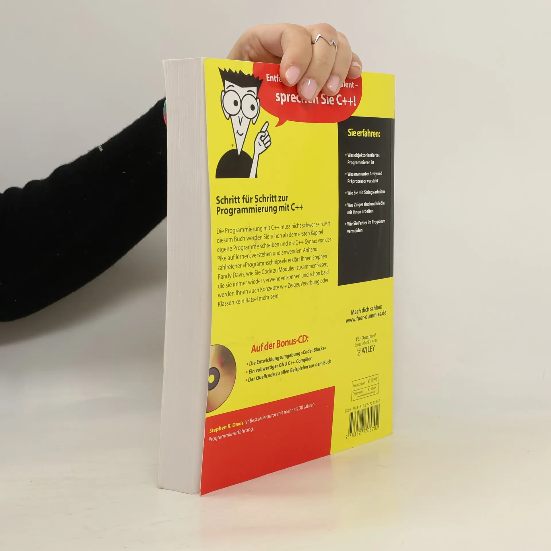 Die Programmierung mit C++ muss nicht schwer sein. Mit diesem Buch werden Sie schon ab dem ersten Kapitel eigene Programme schreiben und die C++-Syntax von der Pike auf lernen, verstehen und anwenden. Anhand zahlreicher „Programmschnipsel“ erklärt Ihnen Stephen Randy Davis, wie Sie Code zu Modulen zusammenfassen, die sie immer wieder verwenden können und schon bald werden Ihnen auch Konzepte wie Zeiger, Vererbung oder Klassen kein Rätsel mehr sein.
