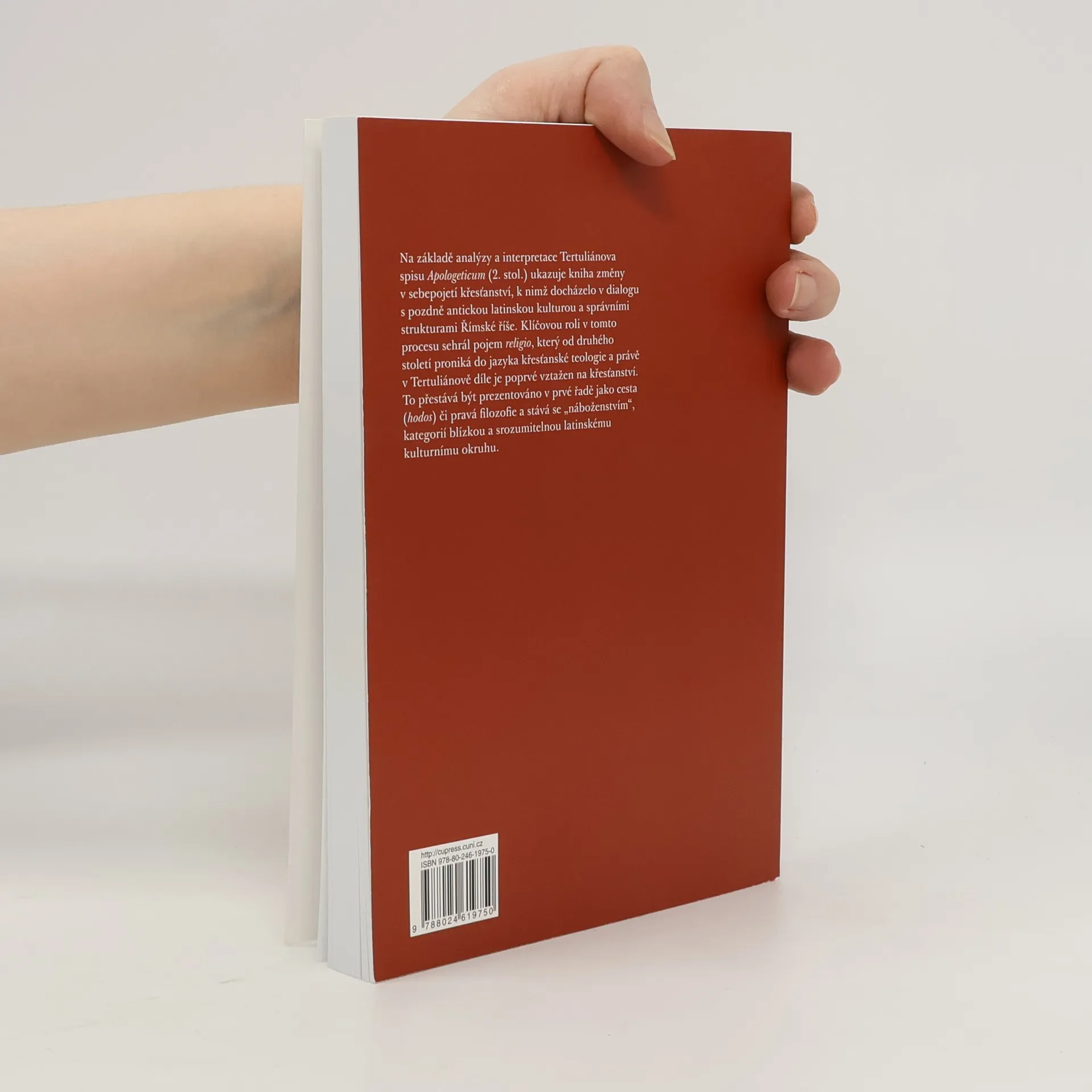 Monografie na základě analýzy a interpretace Tertuliánova spisu Apologeticum (2. stol.) sleduje změny v sebepojetí křesťanství, k nimž docházelo v dialogu s pozdně antickou latinskou kulturou a správními strukturami Římské říše. Klíčovou roli v tomto procesu sehrál pojem religio, který od druhého století proniká do jazyka křesťanské teologie a právě v Tertuliánově díle je poprvé vztažen na křesťanství. To přestává být prezentováno v prvé řadě jako cesta (hodos) či pravá filozofie a stává se „náboženstvím“, kategorií blízkou a srozumitelnou latinskému kulturnímu okruhu.