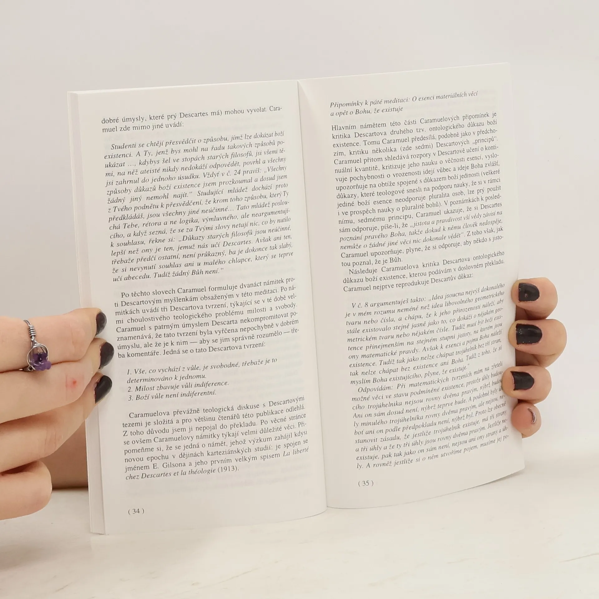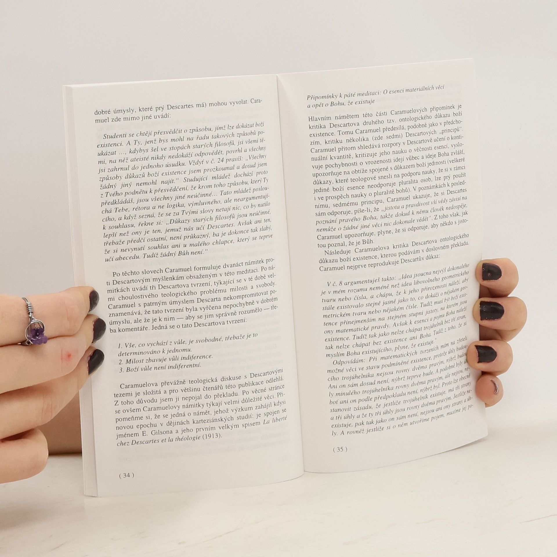 Ohlas Descartových spisů v českých zemích je spojen především se jménem emauzského opata Jana Caramuela z Lobkovic. Napsal obsáhlé Připomínky ke karteziánským Meditacím , jejichž rukopis byl nedávno objeven a vydán v Itálii. Publikace obsahuje překlad vybraných částí Připomínek, Caramuelův životopis, komentář a úvahu o celkovém rázu recepce karteziánství v 17. století v našem prostředí.