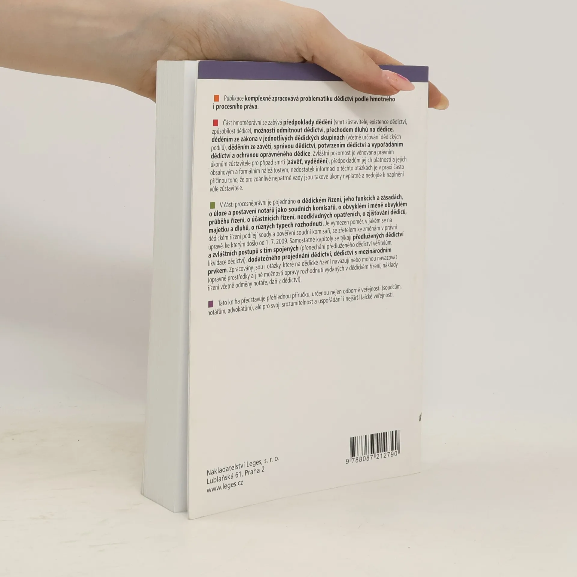 Publikace se komplexně zabývá problematikou dědictví z pohledu hmotného a procesního práva. Hmotněprávní část se zaměřuje na předpoklady dědění, jako jsou smrt zůstavitele, existence dědictví a způsobilost dědice. Dále se věnuje možnosti odmítnout dědictví, přechodu dluhů na dědice, dědění ze zákona a ze závěti, správě a potvrzení dědictví, vypořádání a ochraně oprávněného dědice. Zvláštní důraz je kladen na právní úkony zůstavitele pro případ smrti, jako jsou závěti a vydědění, a na jejich platnost a náležitosti, což je v praxi často opomíjeno. V procesněprávní části se analyzuje dědické řízení, jeho funkce a zásady, úloha notářů jako soudních komisařů a průběh řízení. Jsou probrány účastníci řízení, neodkladná opatření, zjišťování dědiců, majetku a dluhů, a různé typy rozhodnutí. Publikace také vymezuje poměr soudů a soudních komisařů v dědickém řízení, reflektujíc změny od 1. 7. 2009. Dále se zabývá předluženými dědictvími, dodatečným projednáním a mezinárodním dědictvím. Kniha se dotýká i otázek, které navazují na dědické řízení, jako jsou opravné prostředky a náklady řízení. Tento přehledný materiál je určen odborné veřejnosti i laické veřejnosti díky své srozumitelnosti.