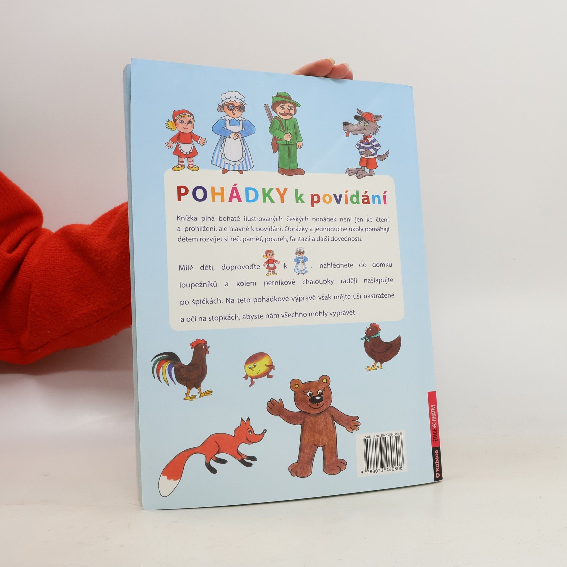 Knížka plná bohatě ilustrovaných českých pohádek není jen ke čtení a prohlížení, ale hlavně k povídání. Obrázky a jednoduché úkoly pomáhají dětem rozvíjet si řeč, paměť, postřeh, fantazii a další dovednosti. Milé děti, doprovoďte Červenou Karkulku k babičce, nahlédněte do domku loupežníků a kolem perníkové chaloupky raději našlapujte po špičkách. Na této pohádkové výpravě však mějte uši nastražené a oči na stopkách, abyste nám všechno mohly vyprávět.