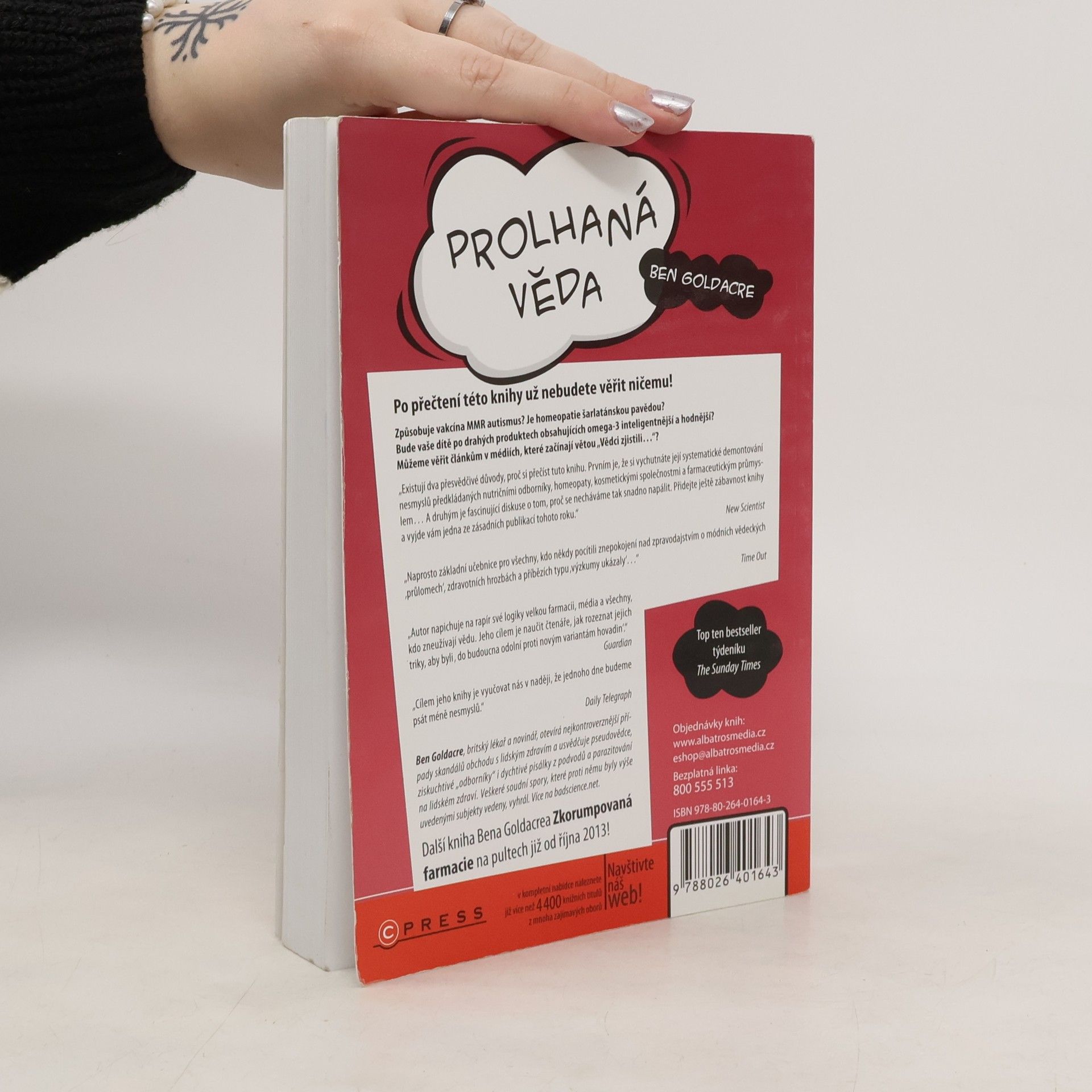 Po přečtení této knihy už nebudete věřit ničemu! Způsobuje vakcína MMR autismus? Je homeopatie šarlatánskou pavědou? Budou vaše děti po drahých produktech s omega-3 inteligentnější? Můžeme věřit článkům v médiích, které začínají větou „Vědci zjistili…“? Existují dva přesvědčivé důvody, proč si tuto knihu přečíst. Prvním je systematické demontování nesmyslů předkládaných nutričními odborníky, homeopaty, kosmetickými společnostmi a farmaceutickým průmyslem. Druhým je fascinující diskuse o tom, proč se necháváme snadno napálit. Kniha je zábavná a stává se jednou ze zásadních publikací tohoto roku. Je to základní učebnice pro všechny, kdo někdy pocítili znepokojení nad zpravodajstvím o módních vědeckých „průlomech“ a zdravotních hrozbách. Autor napichuje na rapír své logiky velkou farmacii, média a všechny, kdo zneužívají vědu. Jeho cílem je naučit čtenáře, jak rozeznat jejich triky, aby byli odolní proti novým variantám hovadin. Cílem jeho knihy je vyučovat nás v naději, že jednoho dne budeme psát méně nesmyslů. Ben Goldacre je publicista, komentátor a lékař, známý svým sloupkem „Bad Science“ v Guardianu. Narodil se v roce 1974 a pracuje na plný úvazek jako lékař ve státním zdravotnictví ve Velké Británii.