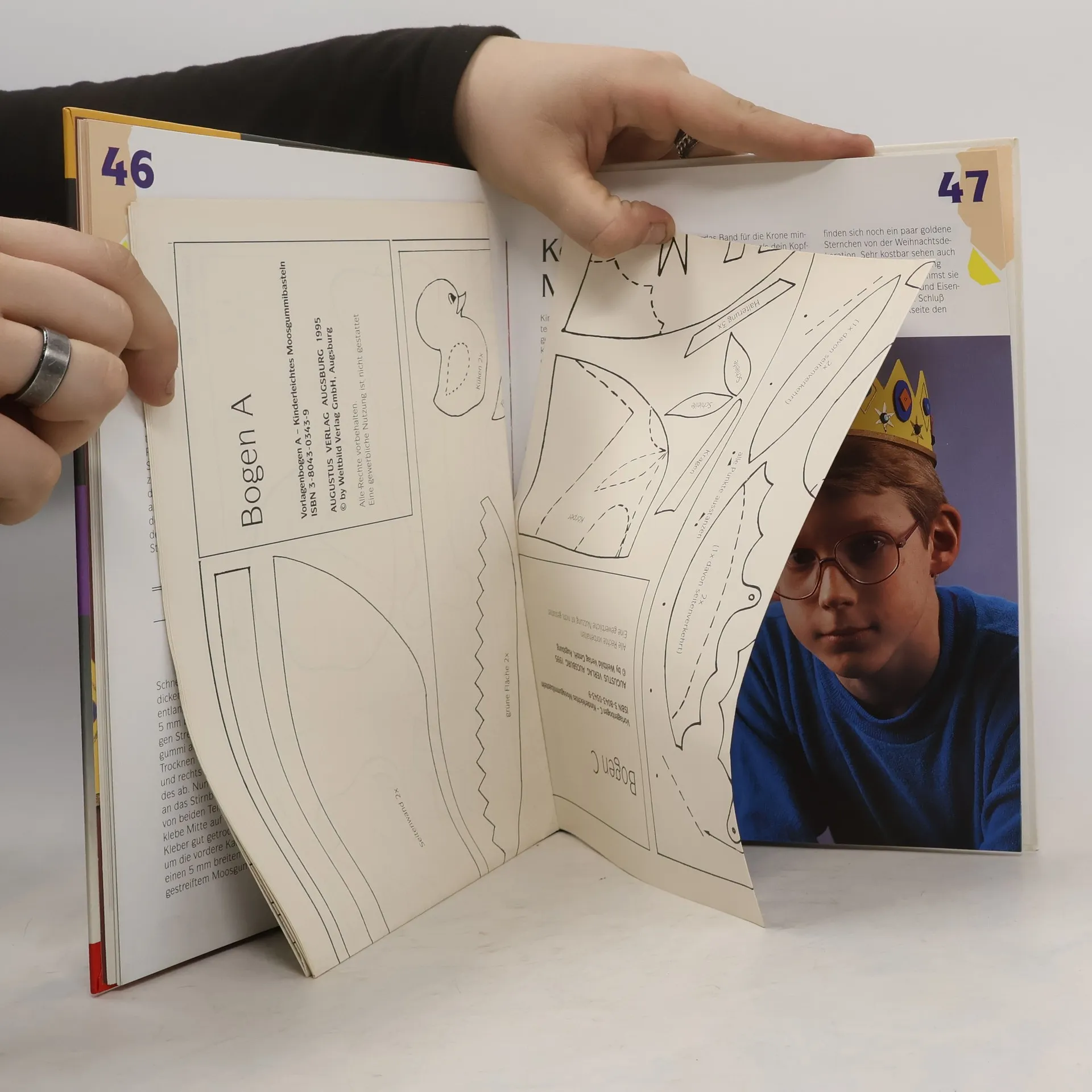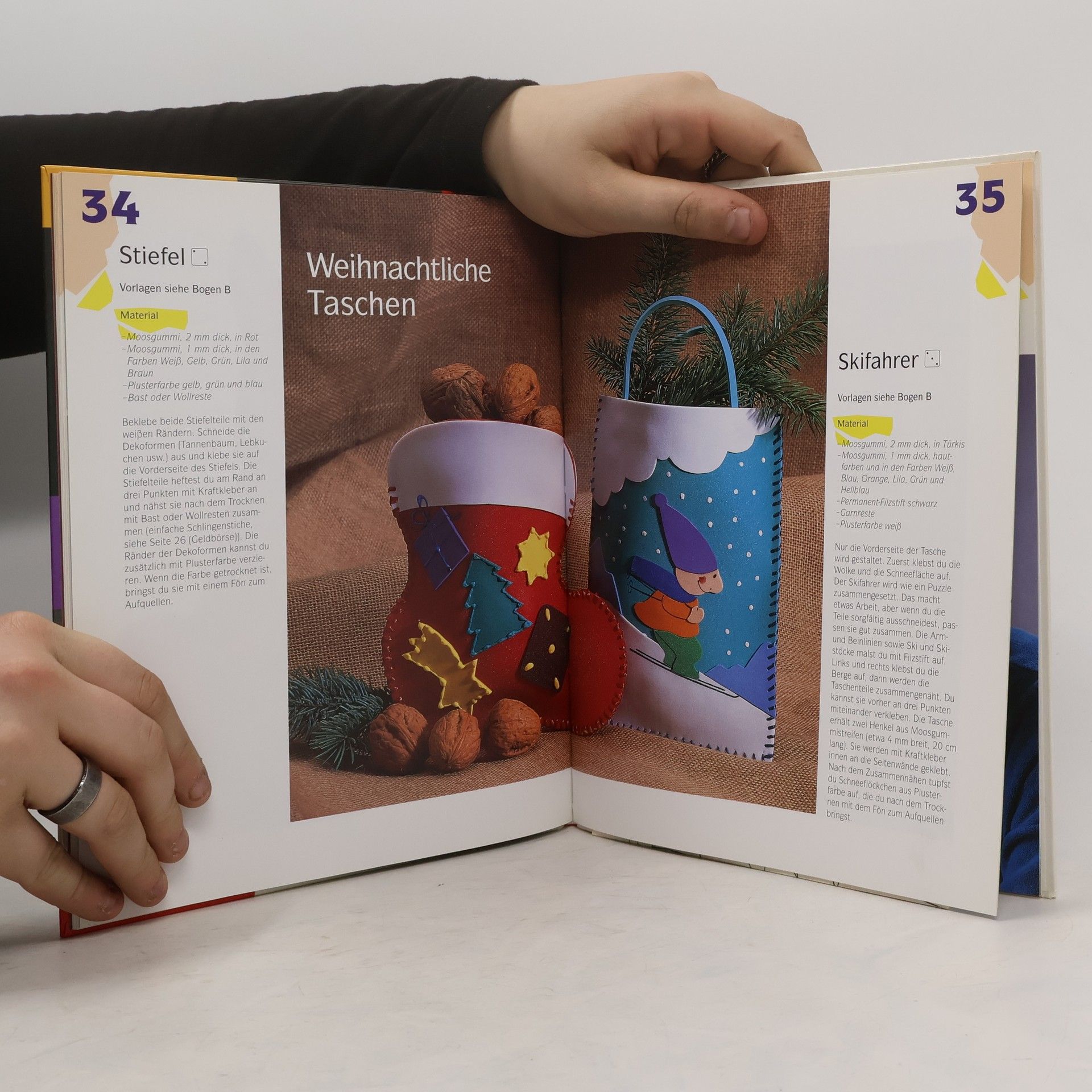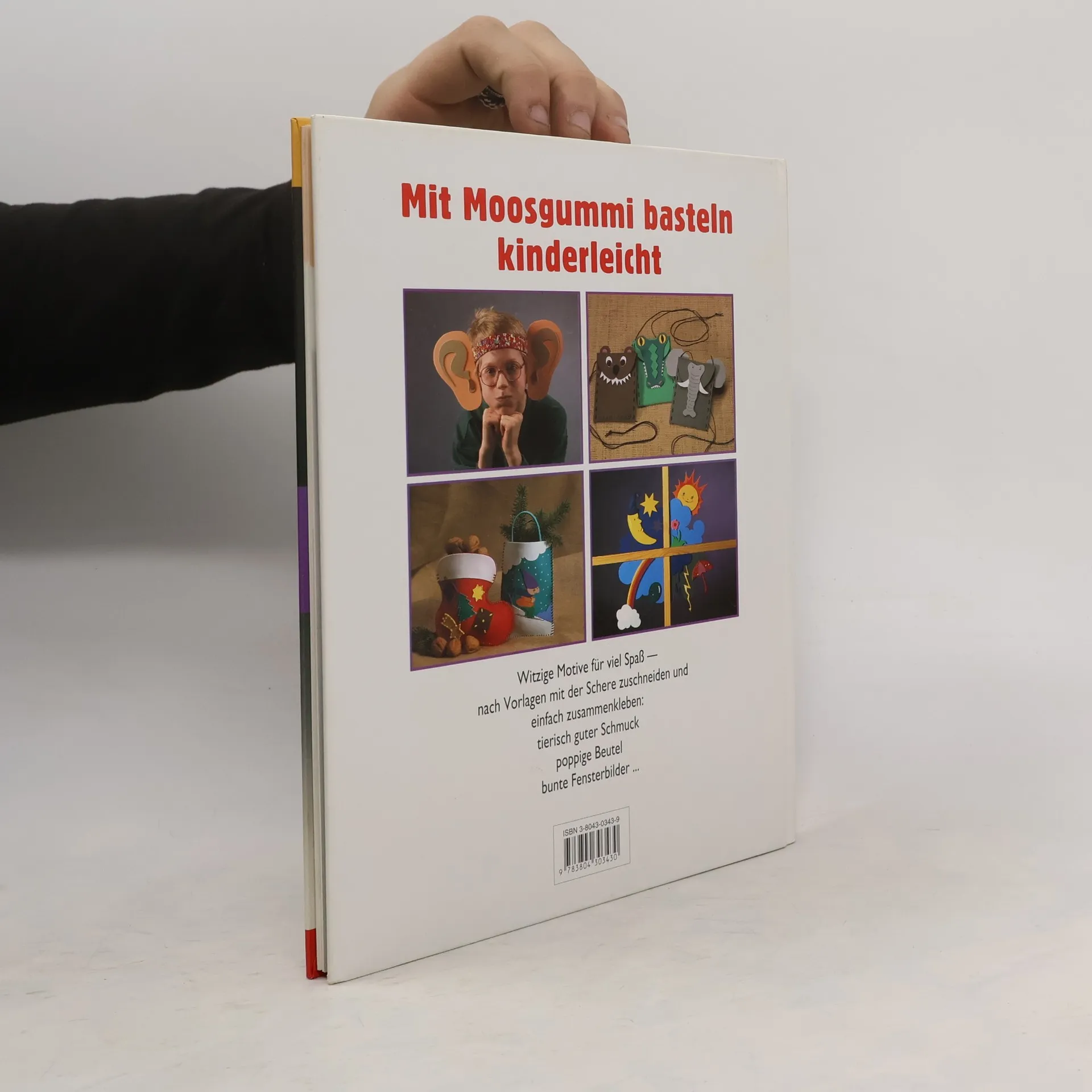 Die Palette des Moosgummi-Angebots umfasst inzwischen Platten von DIN-A5 bis DIN-A2 in 5 Stärken und vielerlei Fertigstanzteile, auch Kugeln, Würfel, Schnüre, etc., für flächiges und plastisches Gestalten. Dazu lässt sich die rauhe Oberfläche des in vielen Farben angebotenen Materials mit Acryl- und Plusterfarben, Permanent-Filzstiften und Dekolack bemalen, mit Schmuckelementen bekleben und, wie Leder, durch vorgestanzte Löcher zusammennähen. Die Autorinnen nützen hier diese Möglichkeiten für originelle Schmucksachen, Fensterbilder, Brustbeutel und Börsen, Osterkörbchen, Mobiles, Fingerpuppen, Schildkappen u.a.m. Würfelsymbole ordnen die Arbeiten 6 Schwierigkeitsstufen zu, die etwa dem Können 6-12jähriger entsprechen. Die genauen Arbeitsanleitungen sind leicht nachzuvollziehen (2 Vorlagebögen). Kindgerechter als im anspruchsvolleren Band "Moosgummi - zauberhafte Fensterbilder" (BA 5/95), kommt man hier mit scharfer Schere statt Cutter und mit unproblematischeren Klebern aus. Ein be