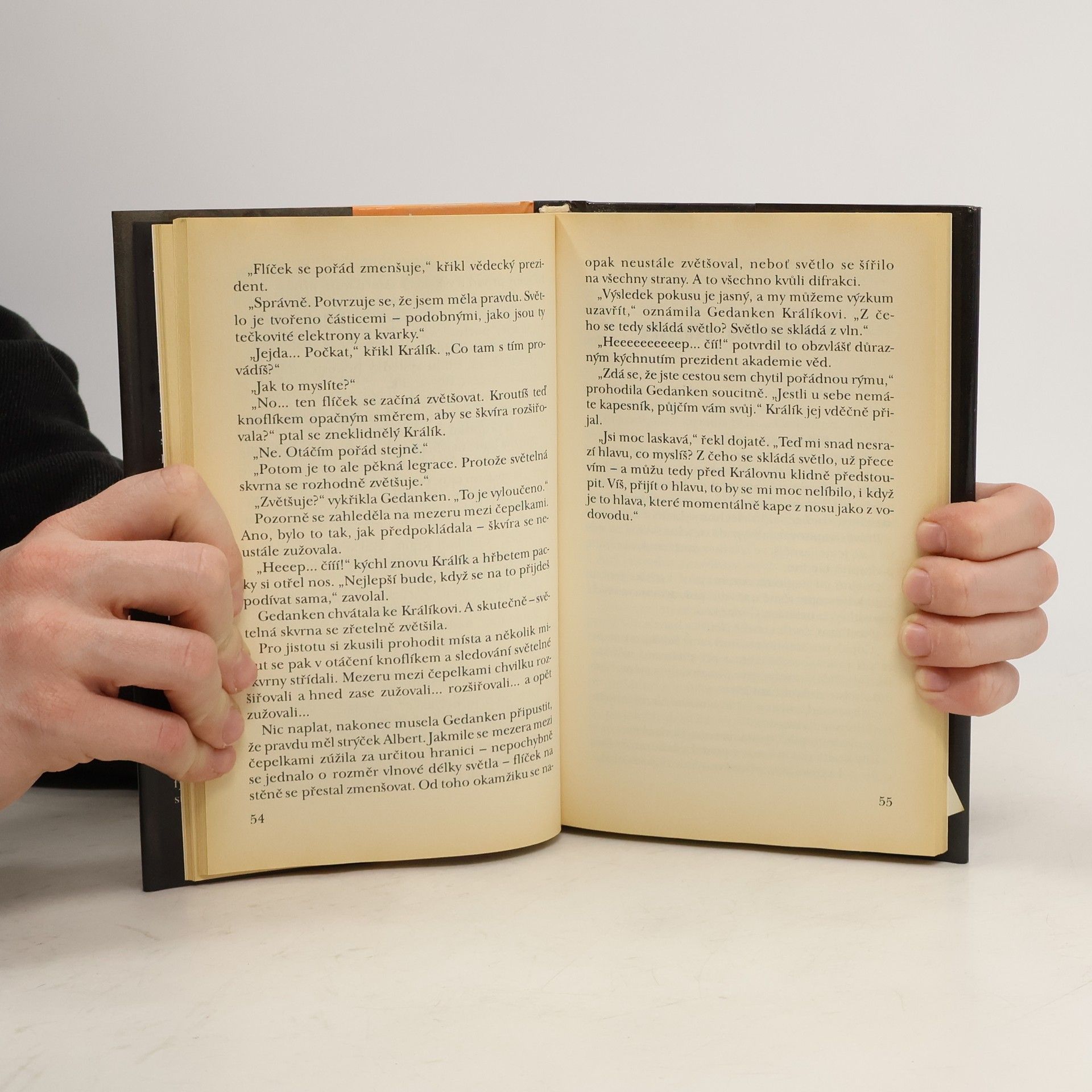 Kniha vysvětlující základy kvantové fysiky a zákony mikrosvěta zábavnými příhodami děvčete Gedanken. Dolů, dolů, pořád dolů... Gedanken už padala hezkých pár minut. Dosud sice neztratila z očí okraj studny, do níž sklouzla, ale teď už to byl pouhý střípek světla míhající se kdesi nesmírně vysoko a daleko. A přitom dno té záhadné studny bylo ještě v nedohlednu. Ne, že by si s tím dělala kdovíjaké starosti. Což bylo ale na pováženou. Taková pád by člověku nějakou tu vrásku nepochybně přidělat měl. Jenže tohle vlastně opravdový pád ani příliš nepřipomínalo. Gedanken měla pocit, že se spíš plavně snáší - asi jako parašutista na padáku. Copak mě tam dole čeká? přemítala celkem nevzrušeně, zatímco zvolna míjela vlhké a tmavé studniční stěny.