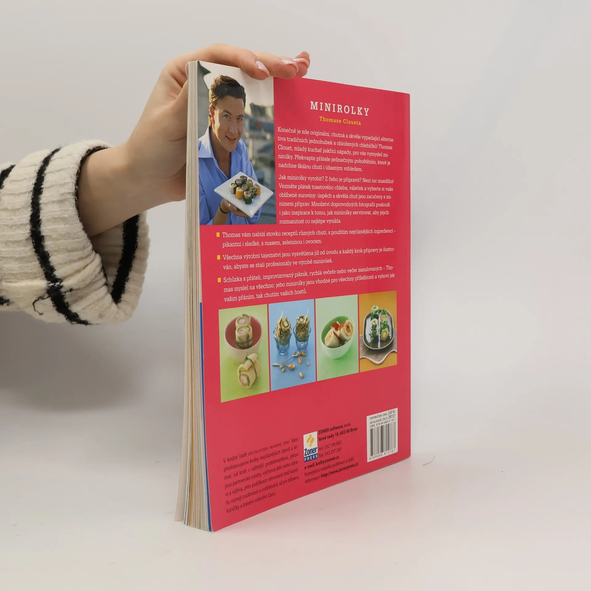 Konečně je zde originální, chutná a skvěle vypadající alternativa tradičních jednohubek a obložených chlebíčků! Thomas Clouet, mladý kuchař jiskřící nápady, pro vás vymyslel minirolky. Překvapte přátele jedinečným pohoštěním, které je nadchne škálou chutí i úžasným vzhledem. Připravte nejrůznější minirolky místo standardních chlebíčků, jednohubek i zákusků. Co to jsou minirolky a jak je vyrobit? Z čeho je připravit? Není nic snazšího! Vezměte plátek toastového chleba, váleček a vyberte si vaše oblíbené suroviny: úspěch a skvělá chuť jsou zaručeny s minimem příprav. Výpravná kniha Thomase Cloueta vám nabízí stovku receptů na minirolky různých chutí, s použitím nejrůznějších ingrediencí – pikantní i sladké, s masem, sýry, zeleninou i ovocem pro nejrůznější příležitosti. Velké množství doprovodných fotografií poslouží i jako inspirace k tomu, jak minirolky servírovat, aby jejich rozmanitost a vzhled co nejlépe vynikly. Všechna výrobní tajemství jsou vysvětlena již od úvodu a každý krok přípravy je ilustrován, abyste se stali skutečnými profesionály ve výrobě minirolek. Knihu použijete stejně dobře pro vlastní vaření i jako dárek, který potěší každého.