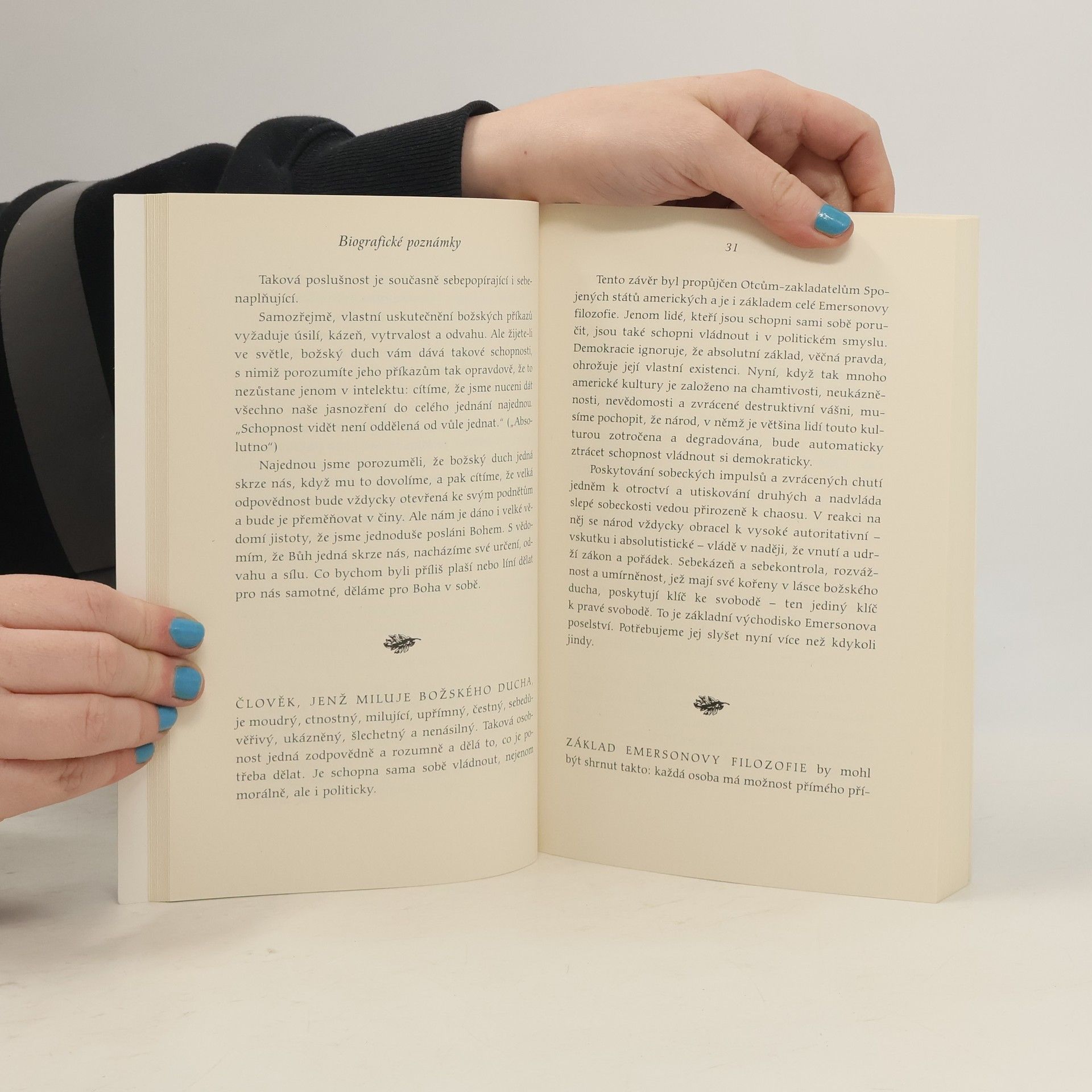 Moudrost jako inspirace pro každodenní život Ralph Waldo Emmerson patří k zakladatelům americké literatury. Na počátku devatenáctého století vydal své slavné Eseje. Richard Whelan je upravil, vybral z nich to nejpodstatnější a nabídl je současnému čtenáři v podobě této knihy. „Může-li něco znovu obnovit základní ctnosti v našem životě a zasít je i do vědomí našeho národa, je to Emersonova vize světa naplněná božským duchem a duchovním zákonem,“ říká Whelan.