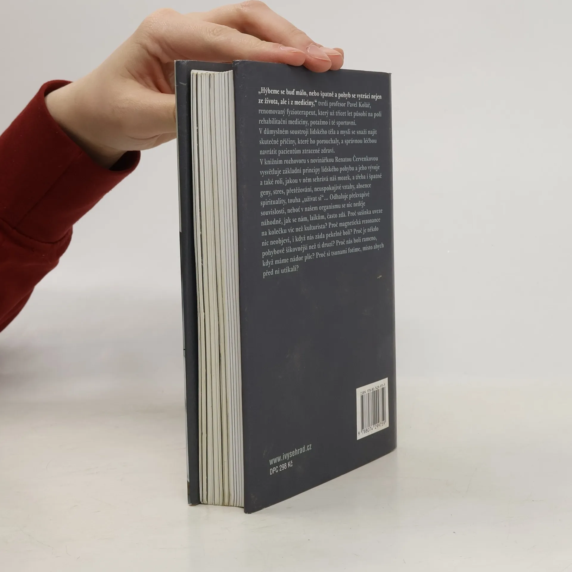 Knižní rozhovor s renomovaným fyzioterapeutem prof. Kolářem. „Hýbeme se buď málo, nebo špatně a pohyb se vytrácí nejen ze života, ale i z medicíny,“ tvrdí profesor Pavel Kolář, renomovaný fyzioterapeut, který už třicet let působí na poli rehabilitační medicíny, potažmo i té sportovní. V důmyslném soustrojí lidského těla a mysli se snaží najít skutečné příčiny, které ho porouchaly, a správnou léčbou navrátit pacientům ztracené zdraví. V rozhovorech s novinářkou Renátou Červenkovou vysvětluje základní principy lidského pohybu a jeho vývoje a také roli, jakou v něm sehrává náš mozek a třeba i špatné geny, stres, přetěžování, neuspokojivé vztahy, absence spirituality, touha „užívat si“... Odhaluje překvapivé souvislosti, neboť v našem organismu se nic neděje náhodně, jak se nám, laikům, často zdá. Proč nás bolí rameno, když máme nádor plic? Proč sušinka uveze na kolečku víc než kulturista? Proč magnetická rezonance nic neobjeví, i když nás záda pekelně bolí? Proč je někdo pohybově šikovnější než ti druzí? Proč si tsunami fotíme, místo abychom před ní utíkali?