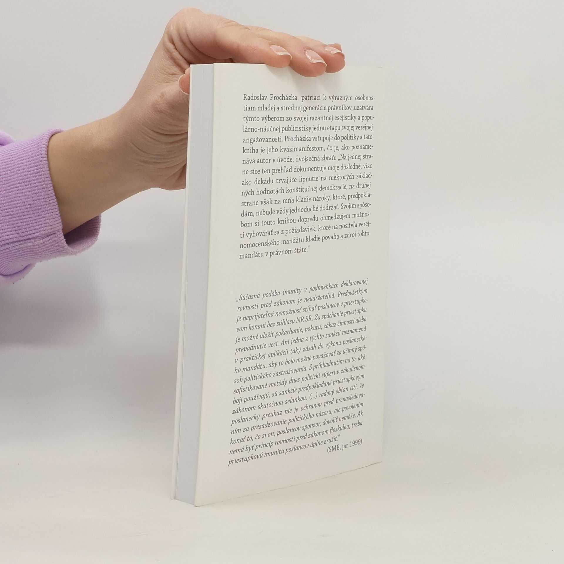 Radoslav Procházka, patriaci k výrazným osobnostiam mladej a strednej generácie právnikov, uzatvára týmto výberom zo svojej razantnej esejistiky a populárno-náučnej publicistiky jednu etapu svojej verejnej angažovanosti. Procházka vstupuje do politiky a táto kniha je jeho kvázimanifestom, čo je, ako poznamenáva autor v úvode, dvojsečná zbraň: „Na jednej strane síce ten prehľad dokumentuje moje dôsledné, viac ako dekádu trvajúce lipnutie na niektorých základných hodnotách konštitučnej demokracie, na druhej strane však na mňa kladie nároky, ktoré, predpokladám, nebude vždy jednoduché dodržať. Svojím spôsobom si touto knihou dopredu obmedzujem možnosti vyhovárať sa z požiadaviek, ktoré na nositeľa verejnomocenského mandátu kladie povaha a zdroj tohto mandátu v právnom štáte.“