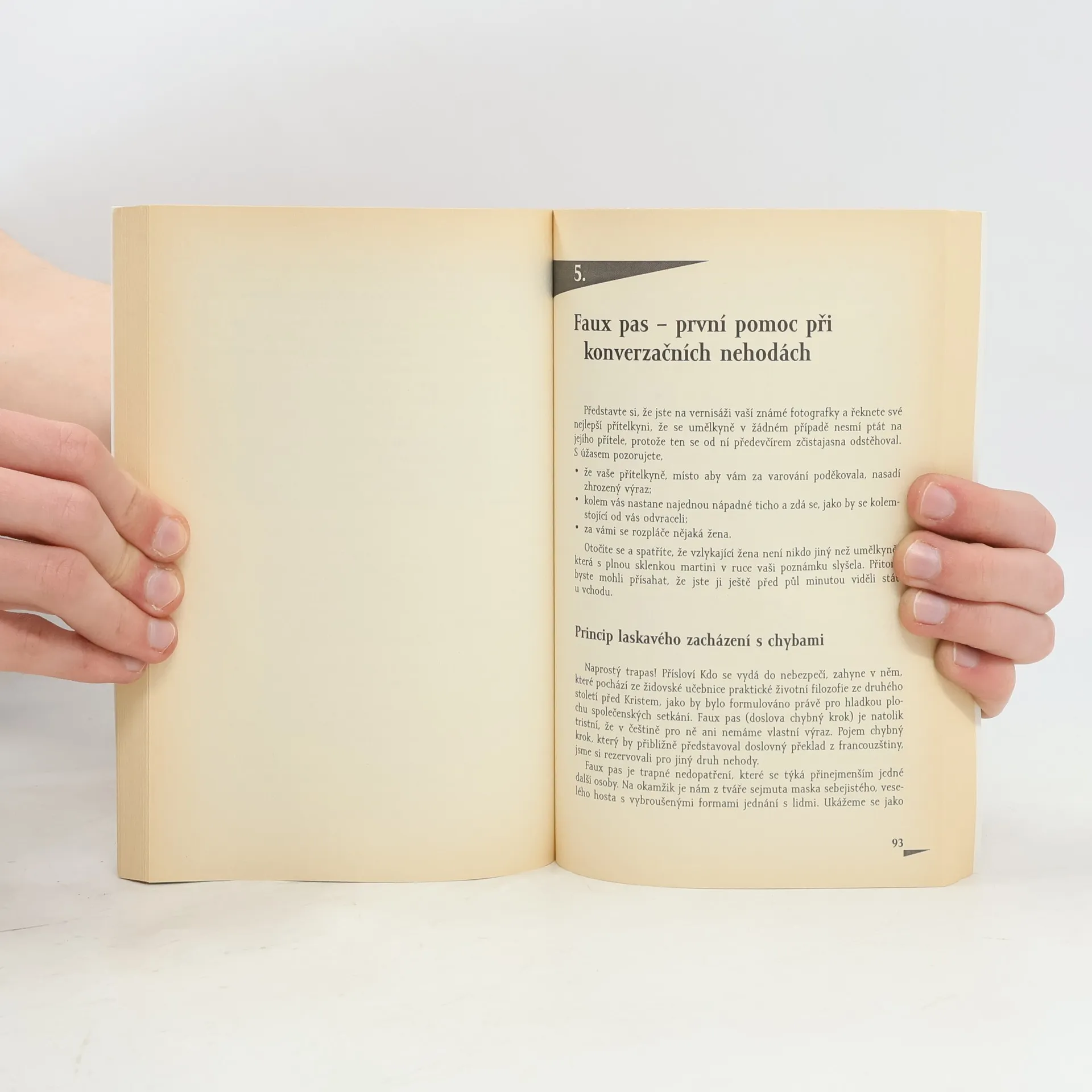 Autor velmi výstižně a názorně popisuje základní pravidla správné společenské konverzace - učí, jak bychom měli při nejrůznějších společenských situacích vést rozhovor, a to po verbální i neverbální stránce. Tedy nejen jak a o čem mluvit, ale také jak se chovat, jak úspěšně používat řeč těla, abychom celkově působili příjemně a uvolněně. V knize nalezneme nejen cenné rady a návody na zvládnutí konverzace, ale rovněž první pomoc při řešení problematických situací či přímo faux pas - ať už se jedná o chyby při konverzaci či setkání s nepříjemnými společníky. Příručka poskytuje rovněž ukázky správné komunikace při konkrétních společenských a životních situacích (např. nezávazné flirtování, návštěva nemocnice či smuteční událost).