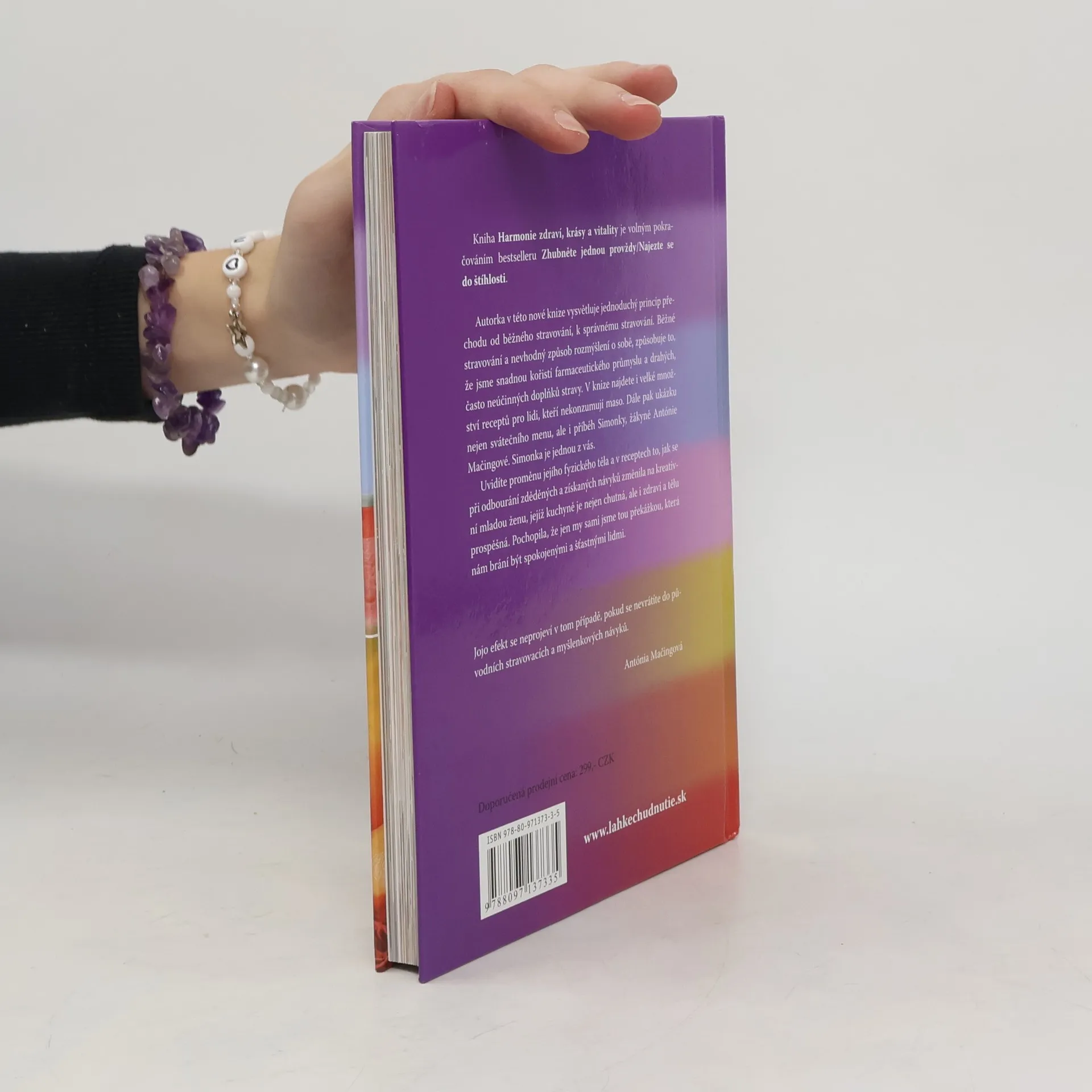 Autorka v této nové knize vysvětluje jednoduchý princip přechodu od běžného stravování, k správnému stravování. Běžné stravování a nevhodný způsob rozmýšlení o sobě, způsobuje to, že jsme snadnou kořistí farmaceutického průmyslu a drahých, často neúčinných doplňků stravy. V knize najdete i velké množství receptů pro lidi, kteří nekonzumují maso. Dále pak ukázku nejen Vánočního menu, ale i příběh Simonky, žákyně Antónie Mačingové. Simonka je jednou z vás. Uvidíte proměnu jejího fyzického těla a v receptech to, jak se při odbourání zděděných a získaných návyků změnila na kreativní mladou ženu, jejíž kuchyně je nejen chutná, ale i zdraví a tělu prospěšná. Pochopila, že jen my sami jsme tou překážkou, která nám brání být spokojenými a šťastnými lidmi. Jojo efekt se neprojeví v tom případě, pokud se nevrátíte do původních stravovacích návyků. Antónia Mačingová