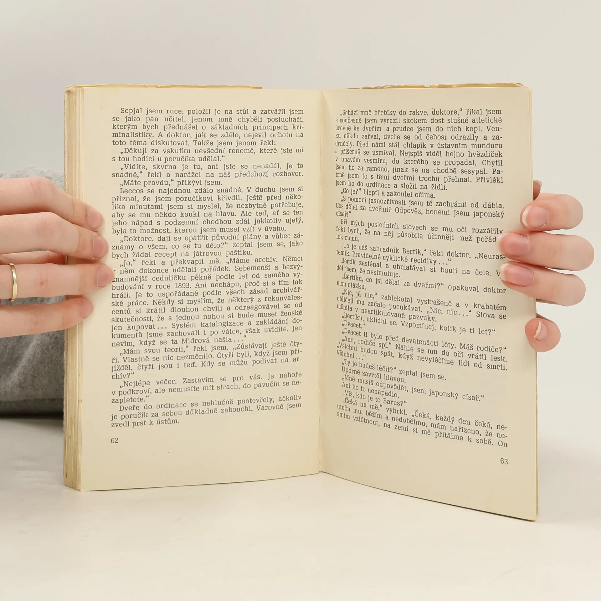 Důstojník Bezpečnosti přichází do ústavu pro choromyslné vypátrat záhadné zmizení čtyř pacientů, přičemž k cíli mu má pomoci s lékařem domluvená, před pacienty a personálem předstíraná schizofrenie. Další zmizení pacienta a jeho zavraždění jako v předchozích případech, důstojníkův boj o vlastní život, záchrana další vyhlédnuté oběti, odhalení vraha a obhájení nevinného člověka stupňují dramatický spád a napětí detektivního románu.