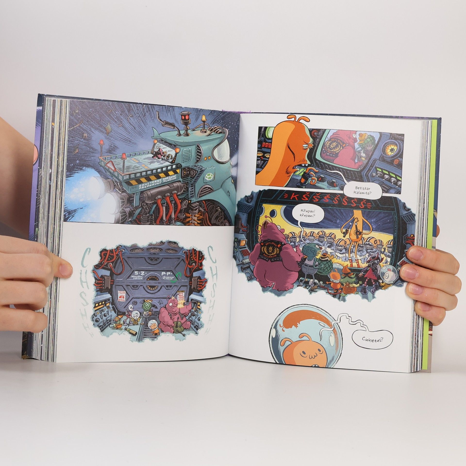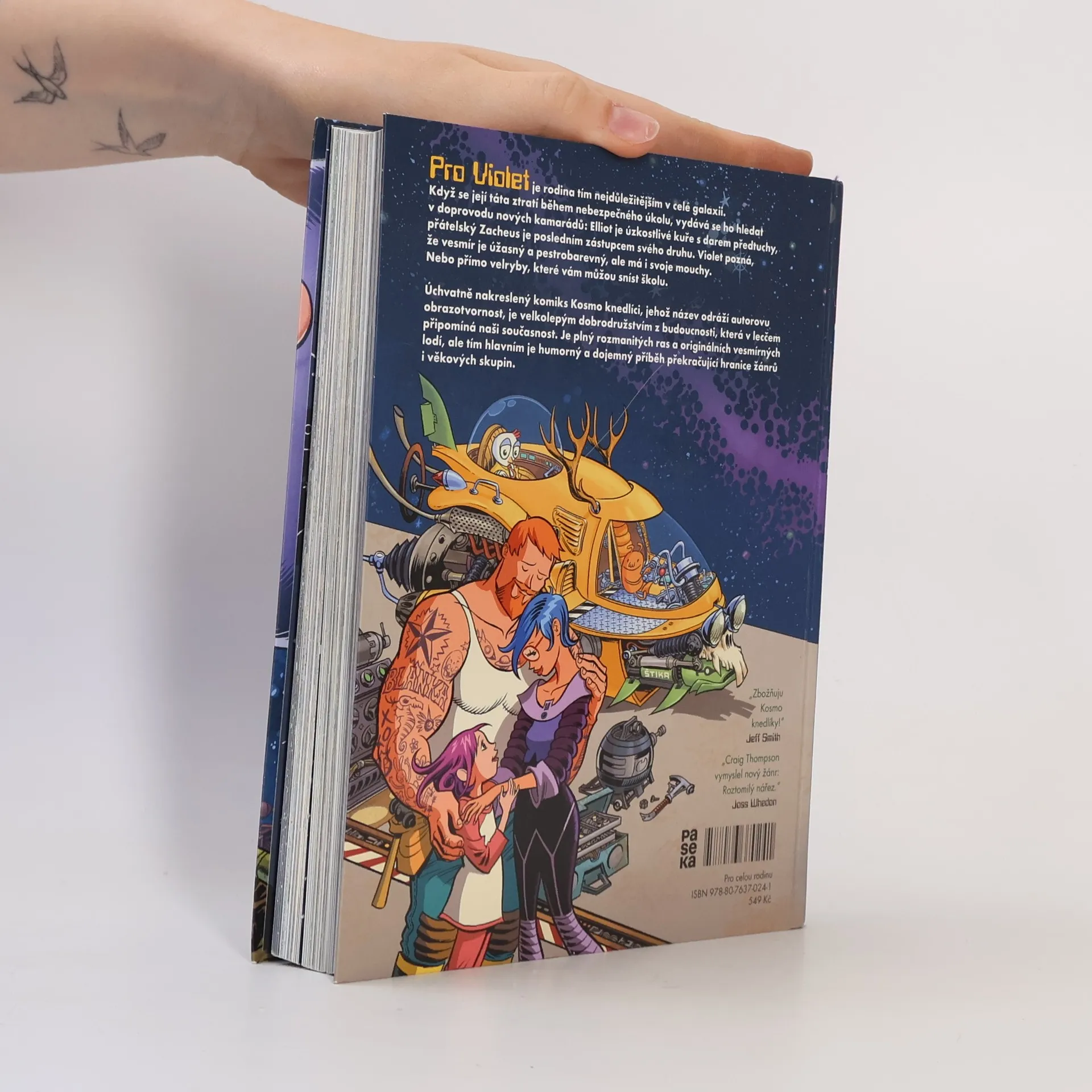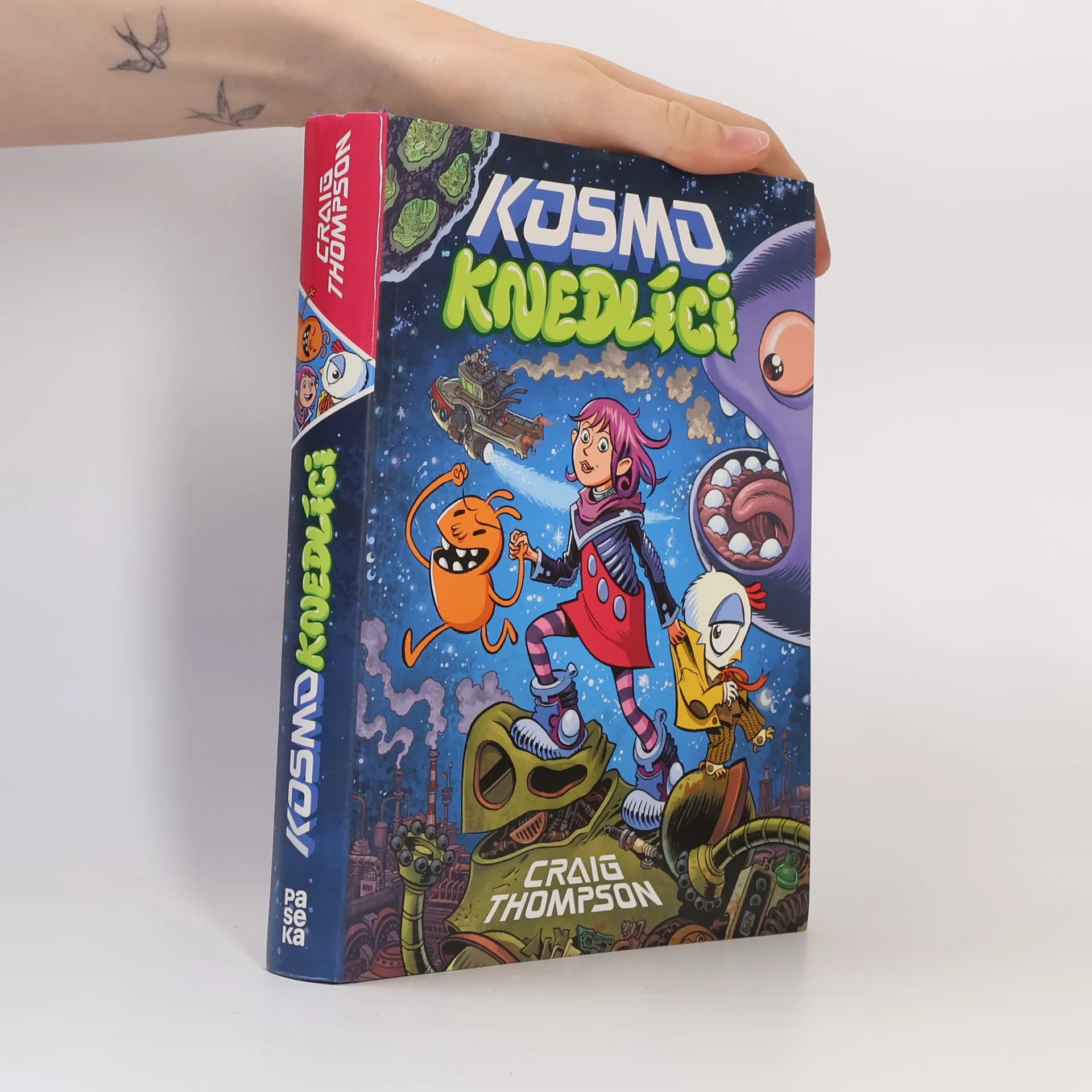Pro Violet je rodina tou nejdůležitější věcí v celé galaxii. Když se její táta ztratí během nebezpečného úkolu, vydává se ho hledat v doprovodu nových kamarádů: Jeden je kuře s věšteckými schopnostmi, druhý je posledním mimozemšťanem svého druhu. Violet pozná, že vesmír je úžasný a pestrobarevný, ale má i svoje mouchy. Nebo přímo velryby, které vám můžou sníst školu. Úchvatně nakreslený komiks Kosmo knedlíci je velkolepým dobrodružstvím z budoucnosti, která nápadně připomíná naši současnost. Je plný rozmanitých ras a originálních vesmírných lodí, ale tím hlavním je humorný i dojemný příběh překračující hranice žánrů i věkových skupin.
