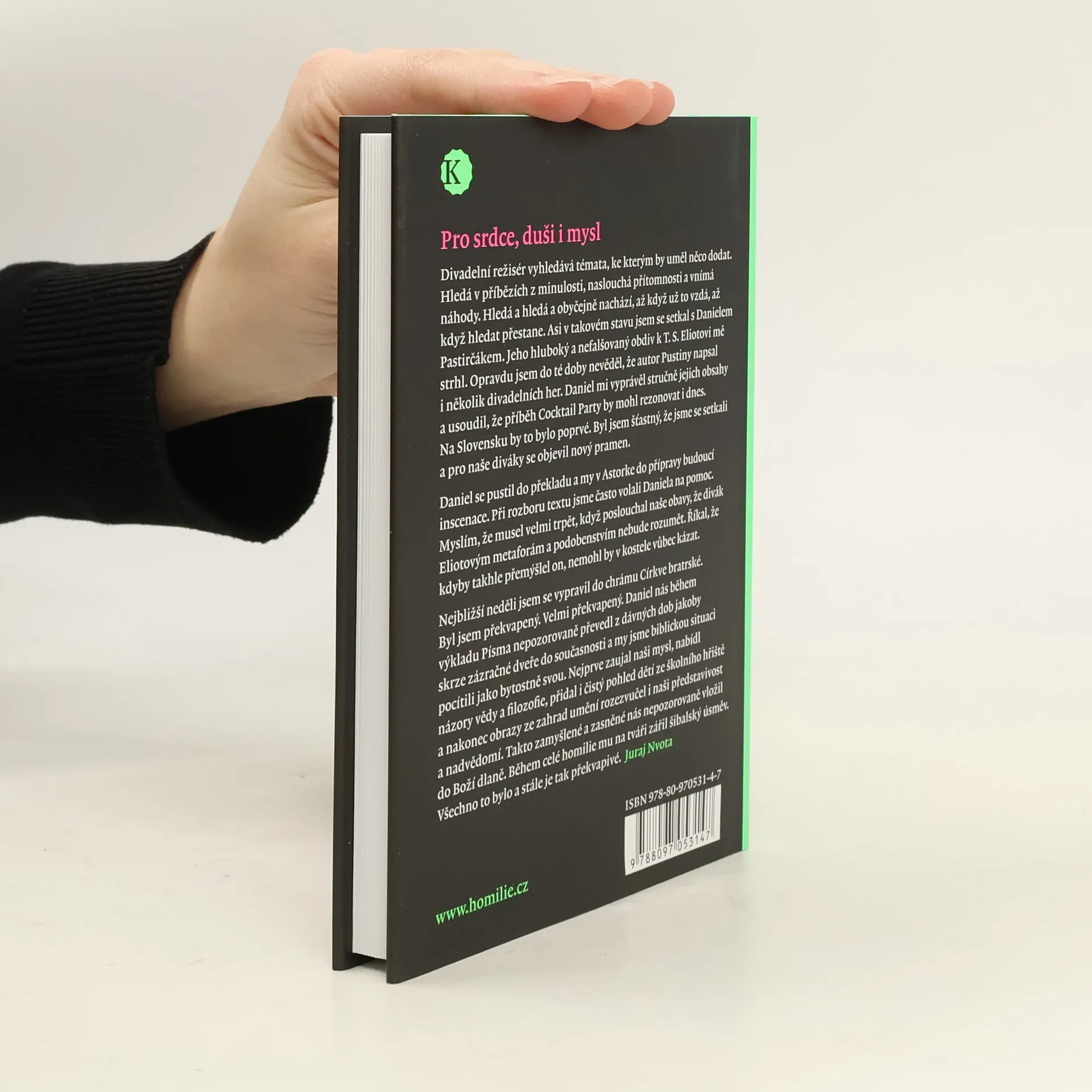 Divadelní režisér neustále hledá témata, která by mohla obohatit jeho práci. Naslouchá příběhům z minulosti, vnímá přítomnost a náhody, a často nachází inspiraci až poté, co přestane hledat. Takto jsem se setkal s Danielem Pastirčákem, jehož obdiv k T. S. Eliotovi mě ohromil. Dozvěděl jsem se, že autor Pustiny napsal i divadelní hry, a Daniel mi přiblížil příběh Cocktail Party, který by mohl rezonovat i dnes. Na Slovensku by to bylo poprvé, a já jsem byl šťastný, že se nám otevřel nový zdroj pro naše diváky. Daniel se pustil do překladu, zatímco my v Astorke připravovali inscenaci. Při analýze textu jsme často volali Daniela na pomoc, a on musel trpět našimi obavami, že diváci nepochopí Eliotovy metafory. Odpověděl, že pokud by takto přemýšlel, nemohl by kázat v kostele. Následující neděli jsem navštívil chrám Církve bratrské a byl jsem překvapen, jak Daniel dokázal přenést biblické příběhy do současnosti. Zaujmul naši mysl, přidal názory vědy a filozofie, a nakonec oslovil naši představivost. Všechny tyto prvky nás nepozorovaně vložily do Boží dlaně, zatímco na jeho tváři zářil šibalský úsměv. Celý zážitek byl a stále je překvapivý. (Juraj Nvota)