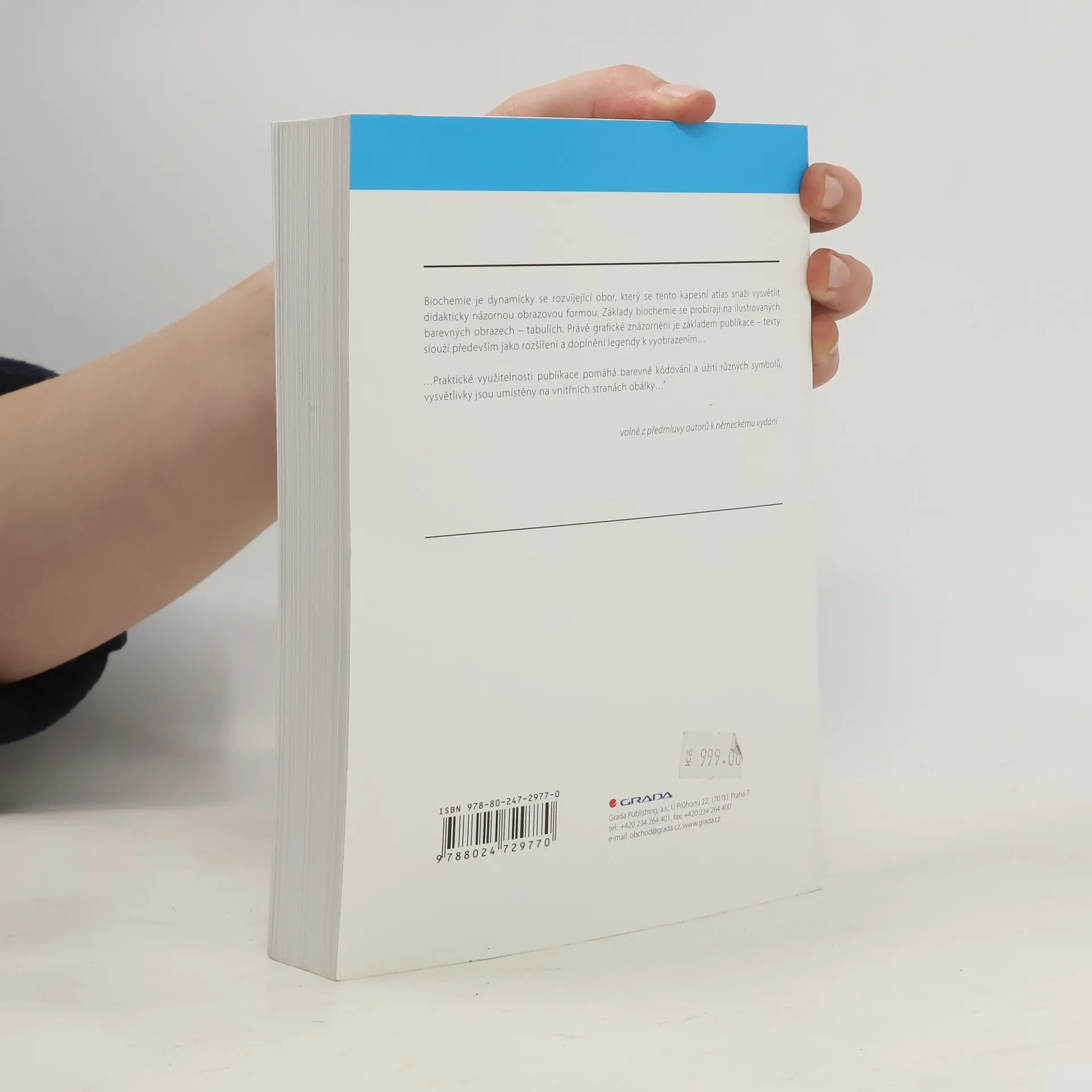 Biochemie člověka přehledně v 228 barevných schématech. Grafické znázornění je základem publikace - texty slouží především jako rozšíření a doplnění legendy k vyobrazením. Publikace krátce uvádí čtenáře do hlavní problematiky chemie a biochemie, zmiňuje provázanost mezi chemickou strukturou a biologickou funkcí nebo patologickými procesy. V knize najde čtenář poslední informace, vývoj a poznatky z oboru, strukturu mnoha důležitých molekul, přílohou publikace je 12 stran tabulí schémat metabolismu, seznam enzymů a mnohé další informace. Nejvíce místa je v tomto atlasu věnováno samozřejmě biochemii člověka, zahrnuje ale i biochemii dalších živočichů, rostlin a mikroorganismů. Didaktické přednosti, které nutno ocenit: vysoká efektivita mezi barevnou grafikou a vysvětlujícím textem - unifikované barevné zobrazení atomů, koenzymů, chemických tříd a buněčných organel umožňující rychlou orientaci a pochopení ve všech zobrazených systémech - rychlé orientaci pomáhá barevné kódování a užití různých symbolů, vysvětlivky jsou umístěny na vnitřních stranách obálky - moderní zobrazení mnoha důležitých molekul. O úspěšnosti publikace mluví i počet jejích vydání (tento překlad vychází ze 4. německého vydání) - kniha vyšla: holandsky (2004); anglicky (1996); francouzsky (1994, 1999, 2004); německy (1994, 1997, 2005, 2009); řecky (1999); indonésky (2002); italsky (1997); japonsky (1996); portugalsky (2004); rusky (2000) a španělsky (2004).