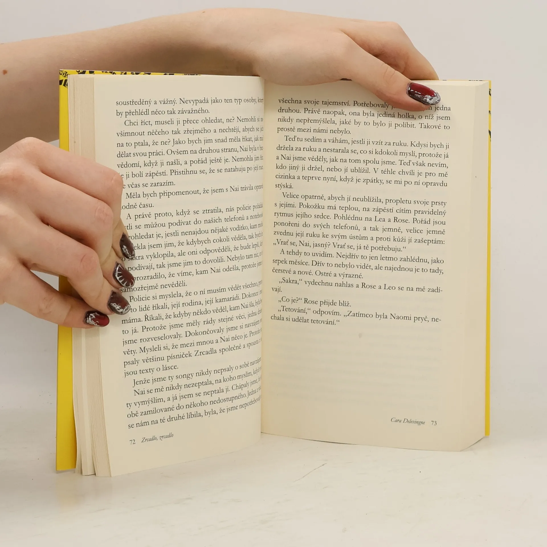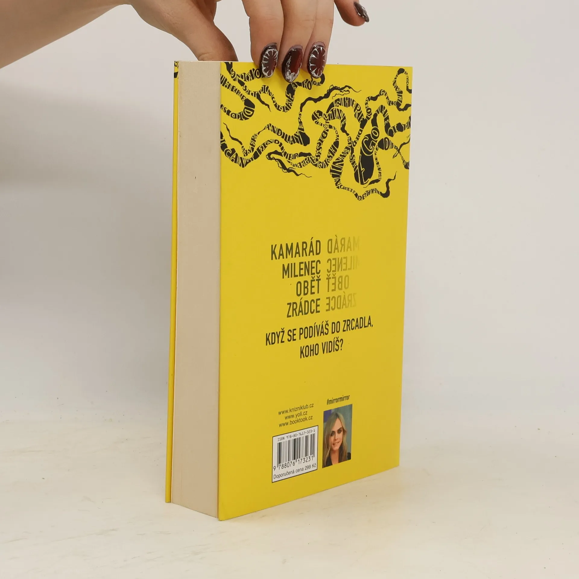 KAMARÁD, MILENKA, OBĚŤ, ZRÁDCE. Když se podíváš do zrcadla, koho vidíš? Debutový román supermodelky a herečky Cary Delevingne. Šestnáctiletí kamarádi Zrzi, Leo, Rose a Naomi tak docela mezi své vrstevníky nezapadají. Stále ještě nepřišli na to, kým chtějí být. Jejich život není dokonalý, ale spojuje je muzika a jejich kapela Zrcadlo, zrcadlo… Až do chvíle, kdy Naomi zmizí a po pár týdnech pátrání je vytažena z řeky v bezvědomí. Naomi v kómatu bojuje o život. Policie tvrdí, že to byl pokus o sebevraždu, její přátelé o tom však silně pochybují. Probere se Naomi někdy? Co její stav zavinilo? A jak je možné, že si Zrzi, samozvaná ochránkyně skupiny, nevšimla varovných signálů? Každý se se složitou situací vyrovnává po svém. Zatímco Rose se opíjí na večírcích a Lea obestírají temné nálady, Zrzi se rozhodne zjistit pravdu. Svět se jim rozpadá a odhaluje jejich nejtemnější tajemství. Nic už nikdy nebude jako dřív, protože když se zrcadlo rozbije, nejde ho nikdy úplně spravit.