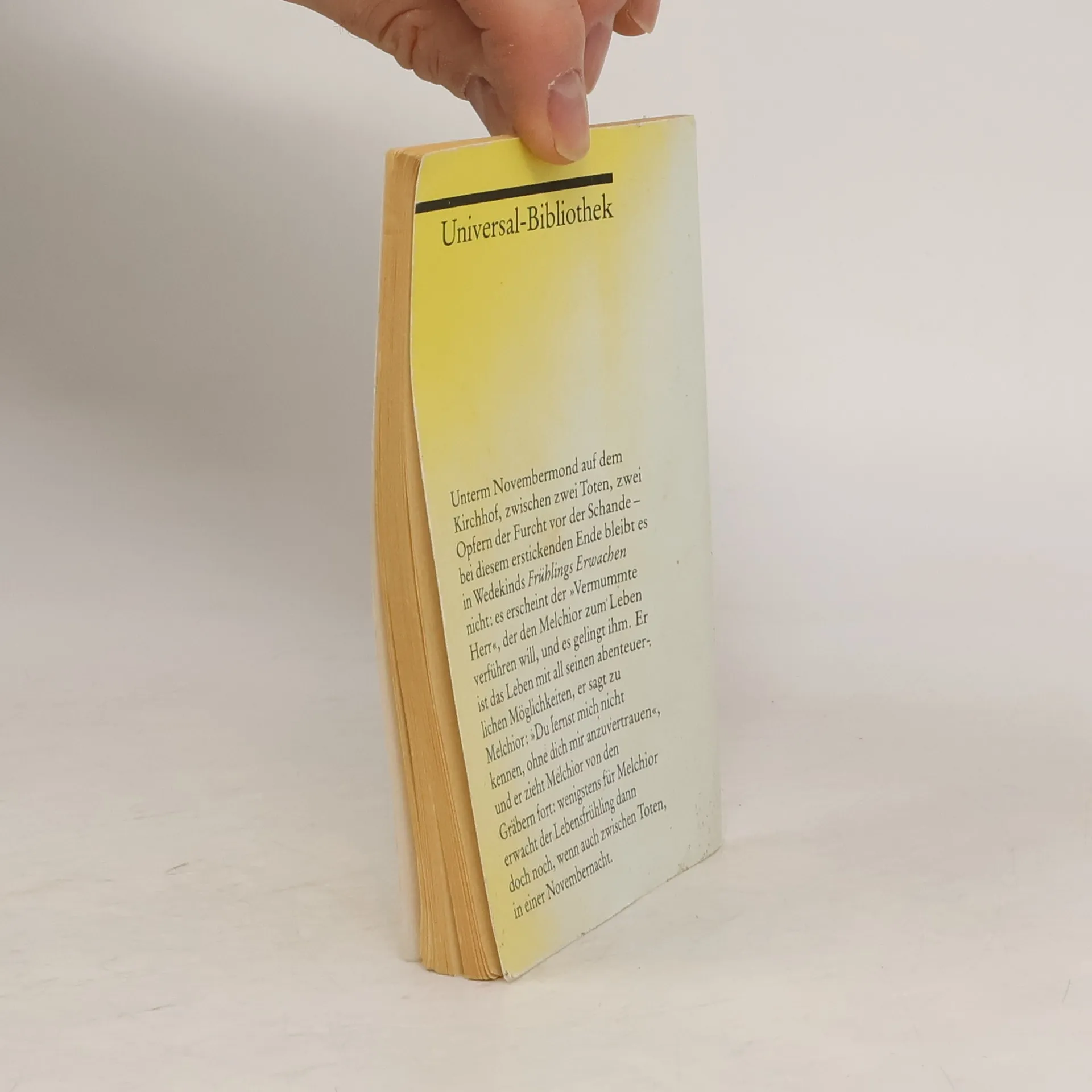 Unterm Novembermond auf dem Kirchhof, zwischen zwei Toten, zwei Opfern der Furcht vor Schande – bei diesem erstickenden Ende bleibt es in Wedekins »Frühlings Erwachen« nicht: es erscheint der »Vermummte Herr«, der den Melchior zum Leben verführen will, und es gelingt ihm. Er ist das Leben mit all seinen abenteuerlichen Möglichkeiten, er sagt zu Melchior: »Du lernst micht nicht kennen, ohne dich mir anzuvertrauen«, und er zieht Melchior von den Gräbern fort: wenigstens für Melchior erwacht der Lebensfrühling dann doch noch, wenn auch zwischen Toten, in einer Novembernacht.