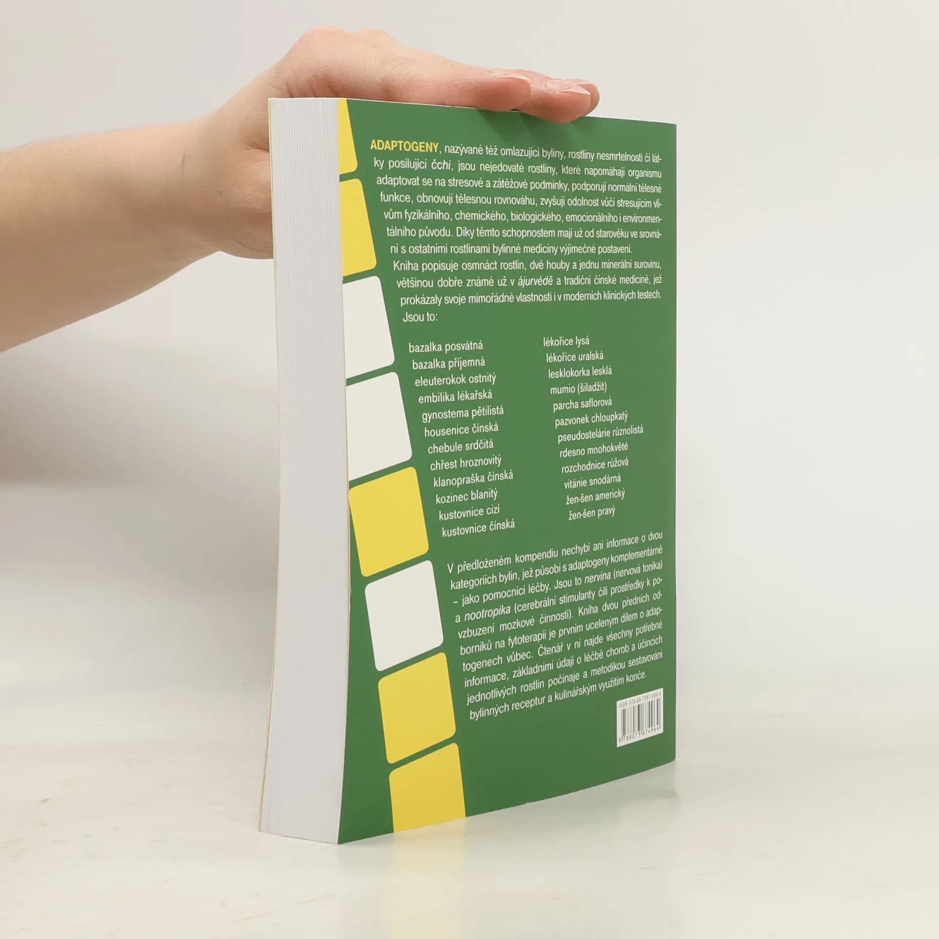 Adaptogeny, známé jako omlazující byliny či rostliny nesmrtelnosti, jsou nejedovaté rostliny, které pomáhají organismu adaptovat se na stres a obnovují tělesnou rovnováhu. Podporují normální funkce těla a zvyšují odolnost vůči stresujícím vlivům různorodého původu. Již od starověku mají v bylinné medicíně výjimečné postavení. Kniha se zaměřuje na osmnáct rostlin, dvě houby a jednu minerální surovinu, které jsou známé z ájurvédy a tradiční čínské medicíny a prokázaly své vlastnosti v moderních klinických testech. Mezi nimi najdeme bazalku posvátnou, eleuterokok ostnitý, gynostemu pětilistou, chebuli srdčitou, kustovnici a žen-šen. Dále se v kompendiu nachází informace o dvou kategoriích bylin, které působí komplementárně s adaptogeny: nervina (nervová tonika) a nootropika (cerebrální stimulanty). Tento přehled, vytvořený předními odborníky na fytoterapii, je prvním uceleným dílem o adaptogenech. Čtenář zde nalezne potřebné informace o léčbě chorob, účincích jednotlivých rostlin, metodice sestavování bylinných receptur a kulinářském využití.