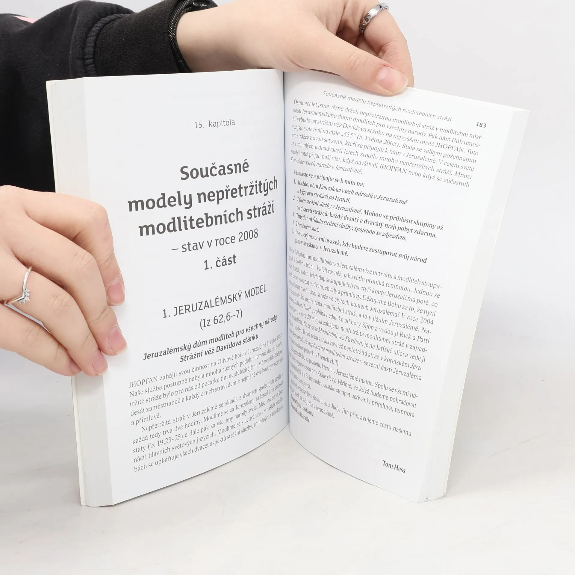 Být připraven a připravovat cestu Mesiáši / Stojíte na stráži a jste připraveni na příchod Mesiáše i na to, co má potkat tento svět? Služby strážců se týká přes 300 biblických veršů. Proč křesťané o této klíčové službě vědí tak málo? Čím víc se přibližujeme konci věků, tím významnější roli budou strážci v přípravách na příchod Mesiáše hrát. Tom Hess, Američan, který na Olivové hoře v Jeruzalémě založil Dům modlitby pro všechny národy, čtenářům pomáhá, aby se role strážce chopili a aby příchod Mesiáše bytostně vyhlíželi.