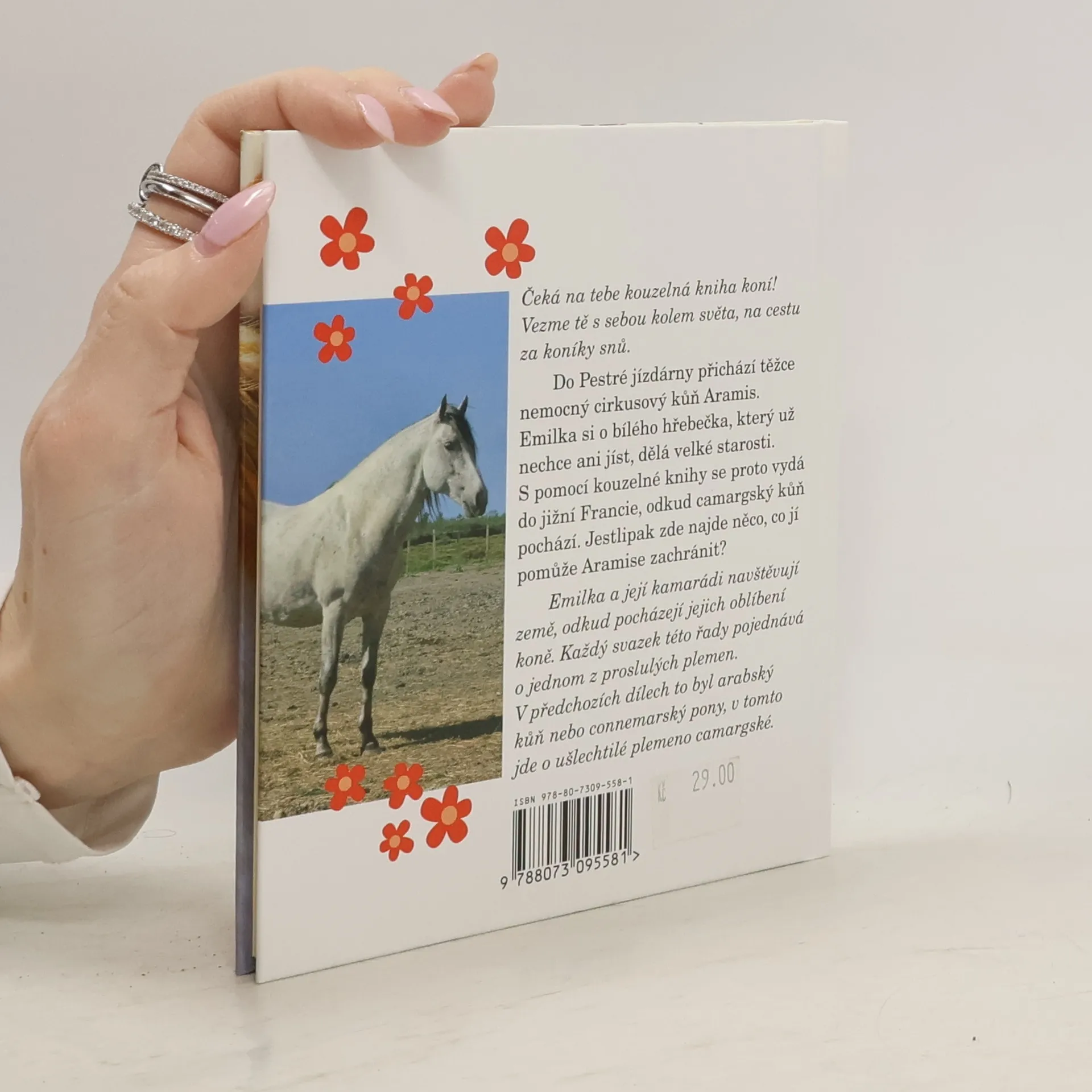 Čeká na tebe kouzelná kniha koní! Vezme tě s sebou kolem světa na cestu za koníky snů. Do Pestré jízdárny přichází těžce nemocny cirkusový kůň Aramis. Emilka se o bílého hřebečka, který už nechce ani jíst, dělá velké starosti. S pomocí kouzelné knihy se proto vydá do jižní Francie, odkud camargský kůň pochází. Jestlipak zde najde něco, co jí pomůže Aramise zachránit? Emilka a její kamarádi navštěvují země, odkud pocházejí jejich oblíbení koně. Každý svazek této řady pojednává o jednom z proslulých plemen. V předchozích dílech to byl arabský kůň nebo connemarský pony, v tomto jde o ušlechtilé plemeno camargské.