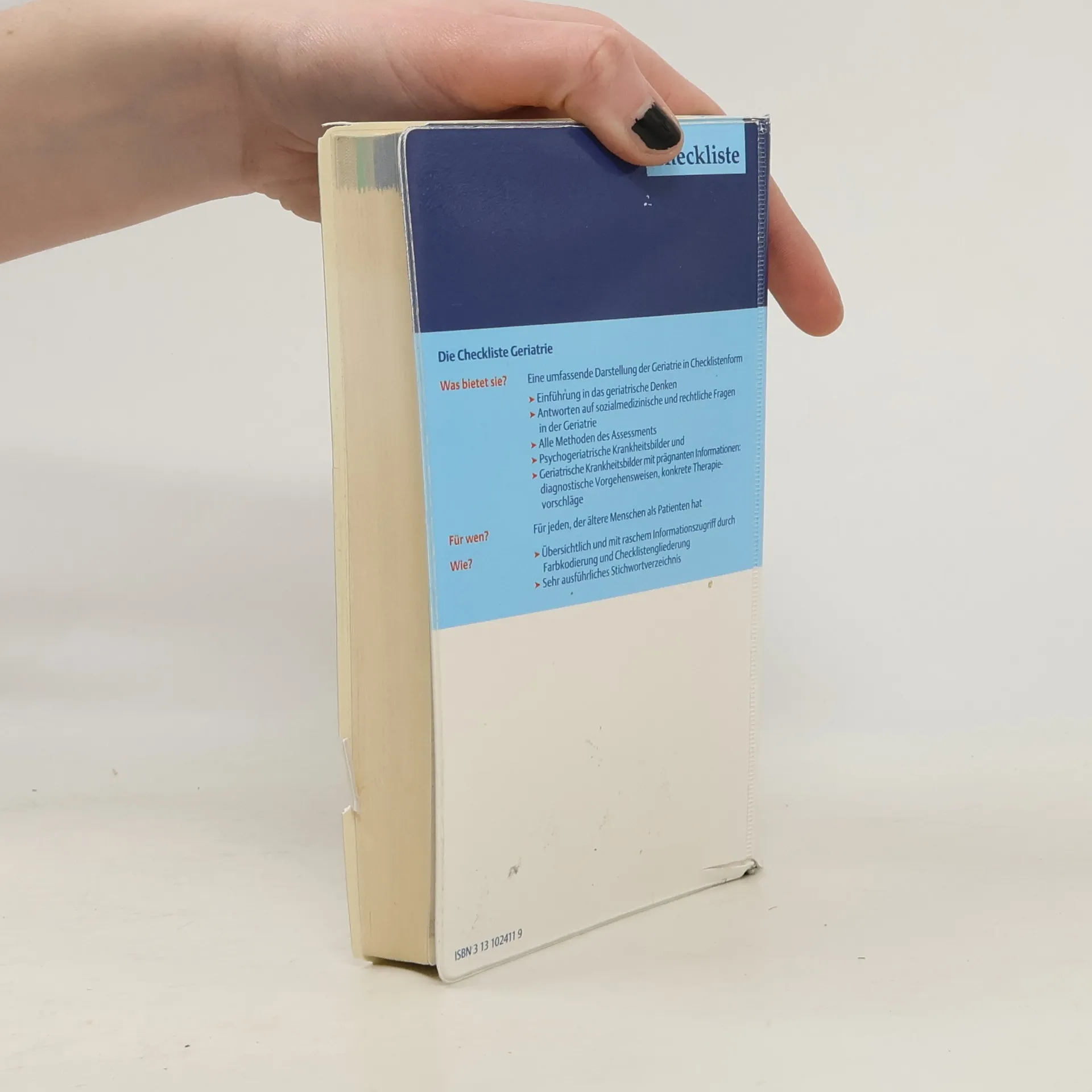 Checkliste Geriatrie - alte Menschen professionell betreuen Für Ihre tägliche Arbeit! - Der graue Teil bildet die Basis mit wichtigen Informationen z. B. zum Altern, zur speziellen Anamnese, Pflege sowie zu versicherungstechnischen Fragestellungen - Alles zum geriatrischen Assessment finden Sie im grünen Teil - Im hellblauen Teil finden Sie den großen Komplex psychogeriatrischer Erkrankungen, z. B. Demenz, Depression, Schlafstörungen - Der dunkelblaue Teil bietet Ihnen detailliert und vollständig Informationen zu allen geriatrisch relevanten Krankheiten Für wen? - Für jeden, der ältere Menschen als Patienten wirklich professionell betreuen möchte Neu in der 2. Auflage - Stark erweiterter Inhalt - neue Kapitel zu Herzrythmusstörungen, Gefäßerkrankungen, Fettstoffwechselstörungen sowie zum großen Thema Altershaut - Die speziellen pharmakologischen Aspekte stehen jetzt direkt bei den jeweiligen Krankheitsbildern - Die gesamte Checkliste ist komplett überarbeitet und aktualisiert - jetzt noch besser für den täglichen Gebrauch