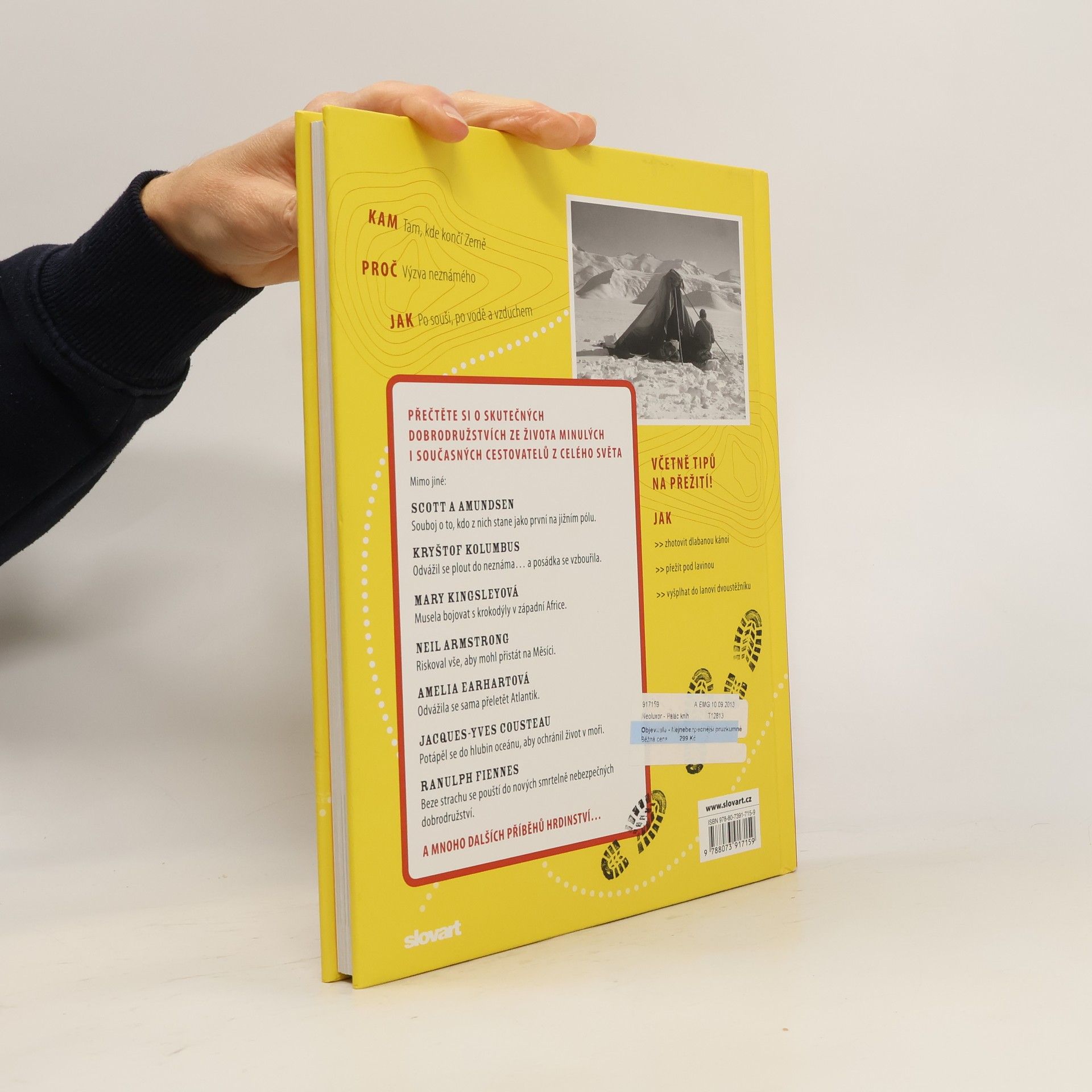 Celá staletí křižovali odvážní cestovatelé pevninu i oceány, aby probádali naši planetu a sestavili dohromady její co nejpodrobnější podobu. Zemský povrch je však už dnes téměř dokonale znám, a tak si novodobí dobrodruzi vytyčují nové výzvy: potápějí se do hlubin oceánů a létají do vesmíru. Bohatě ilustrovaná kniha přináší příběhy čtyřiadvaceti objevitelů a odvážlivců, od Marka Pola a Kryštofa Kolumba přes Edmunda Hillaryho a Tenzinga Norgaye, kteří jako první zdolali Mount Everest, až po Neila Armstronga a Edwina Aldrina, kteří jako první stanuli na Měsíci. Tyto příběhy doprovází též spousta užitečných rad, například jak přežít v divočině či v poušti, jak se vyhnout omrzlinám a zůstat naživu pod lavinou či jak chodit po Měsíci. Kniha jistě potěší a poučí nejen budoucí dobrodruhy, ale i ty, kdo o jejich výkonech rádi čtou v pohodlí obývacího pokoje.