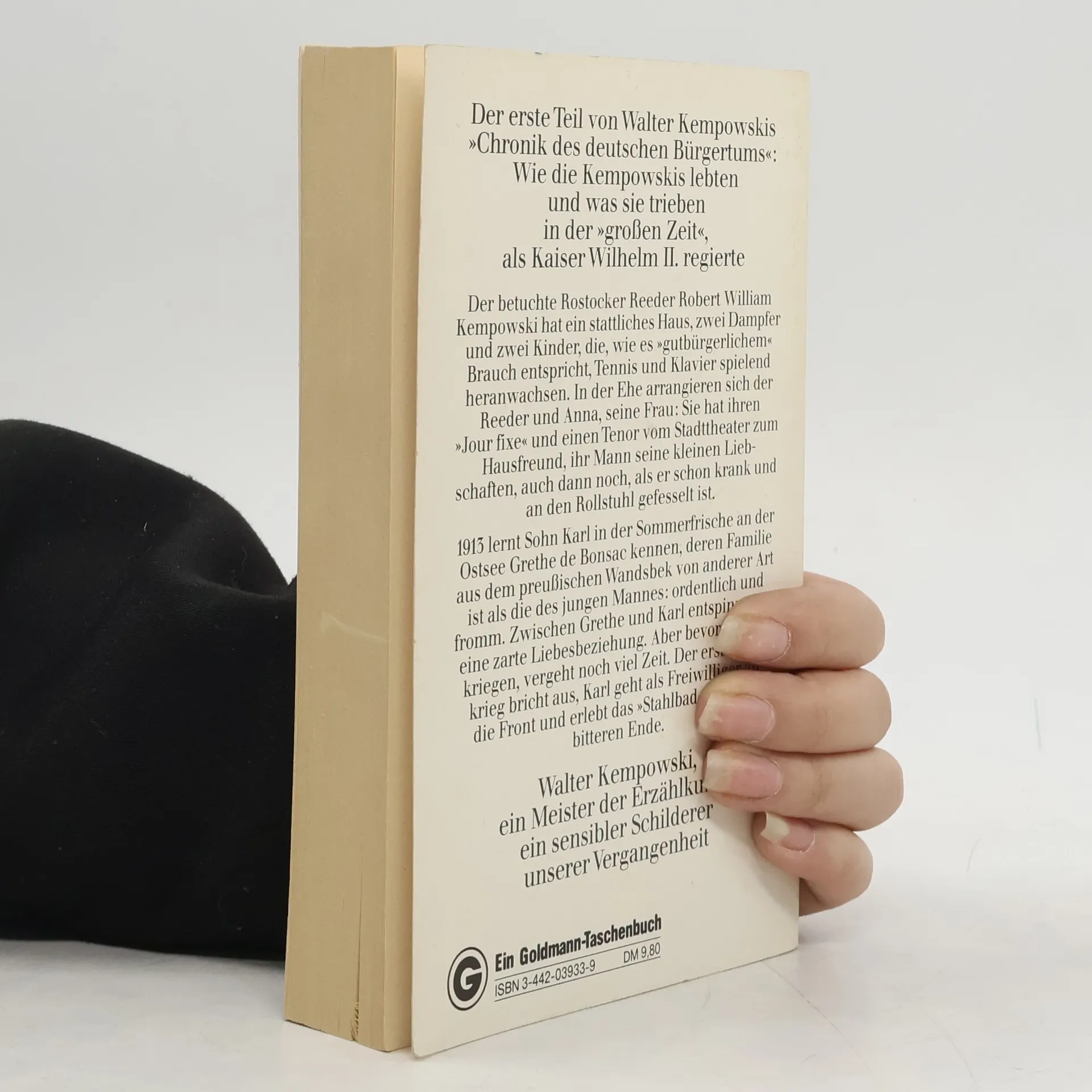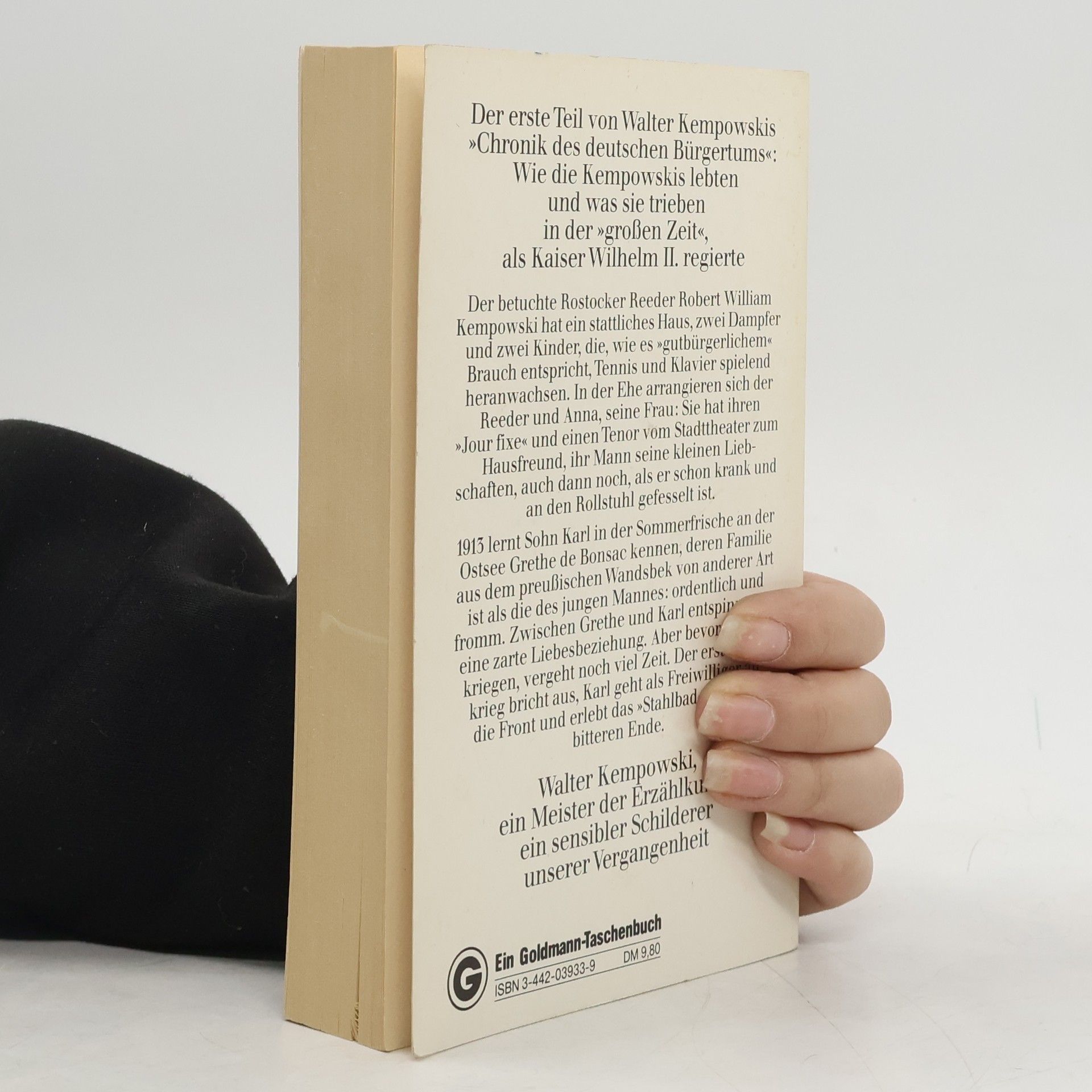 Teil der sogenannten „Deutschen Chronik“ von Walter Kempowski. Der wohlhabende Rostocker Reeder Robert William Kempowski besitzt ein stattliches Haus, zwei Dampfer und zwei Kinder. In der Ehe arrangiert man sich: Anna hat einen Tenor vom Stadttheater zum Hausfreund und auch Robert pflegt seine kleinen Liebschaften. 1913 lernt Sohn Karl an der Ostsee Grethe de Bonsac kennen, deren Familie von anderer Art ist als die seine: ordentlich und fromm. Zwischen Grethe und Karl entspinnt sich eine zarte Liebesgeschichte, die vom Ersten Weltkrieg jäh unterbrochen wird. Karl geht als Freiwilliger an die Front und erlebt das "Stahlbad" bis zu seinem bitteren Ende; Grethe dient dem Vaterland in einem Kinderhort.
