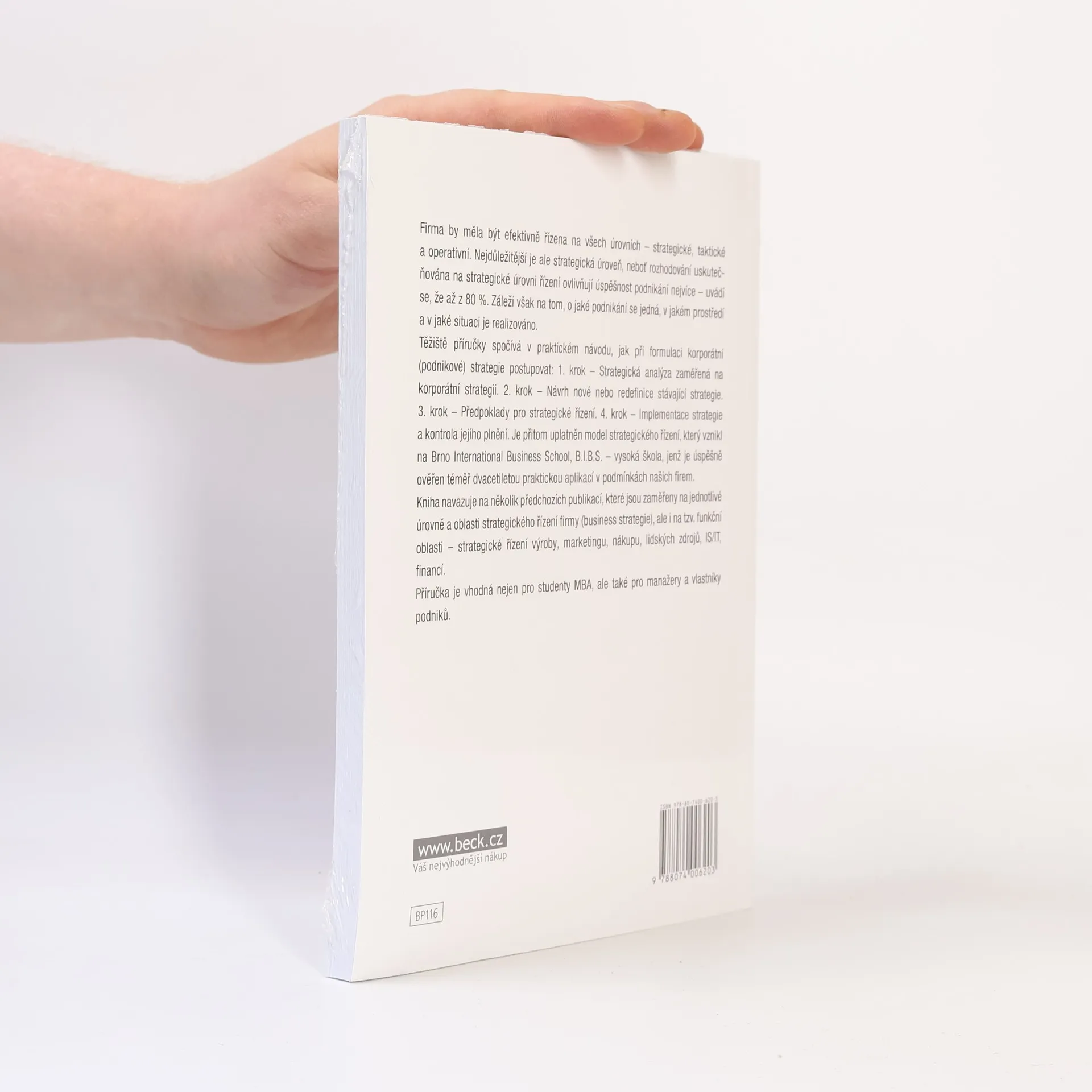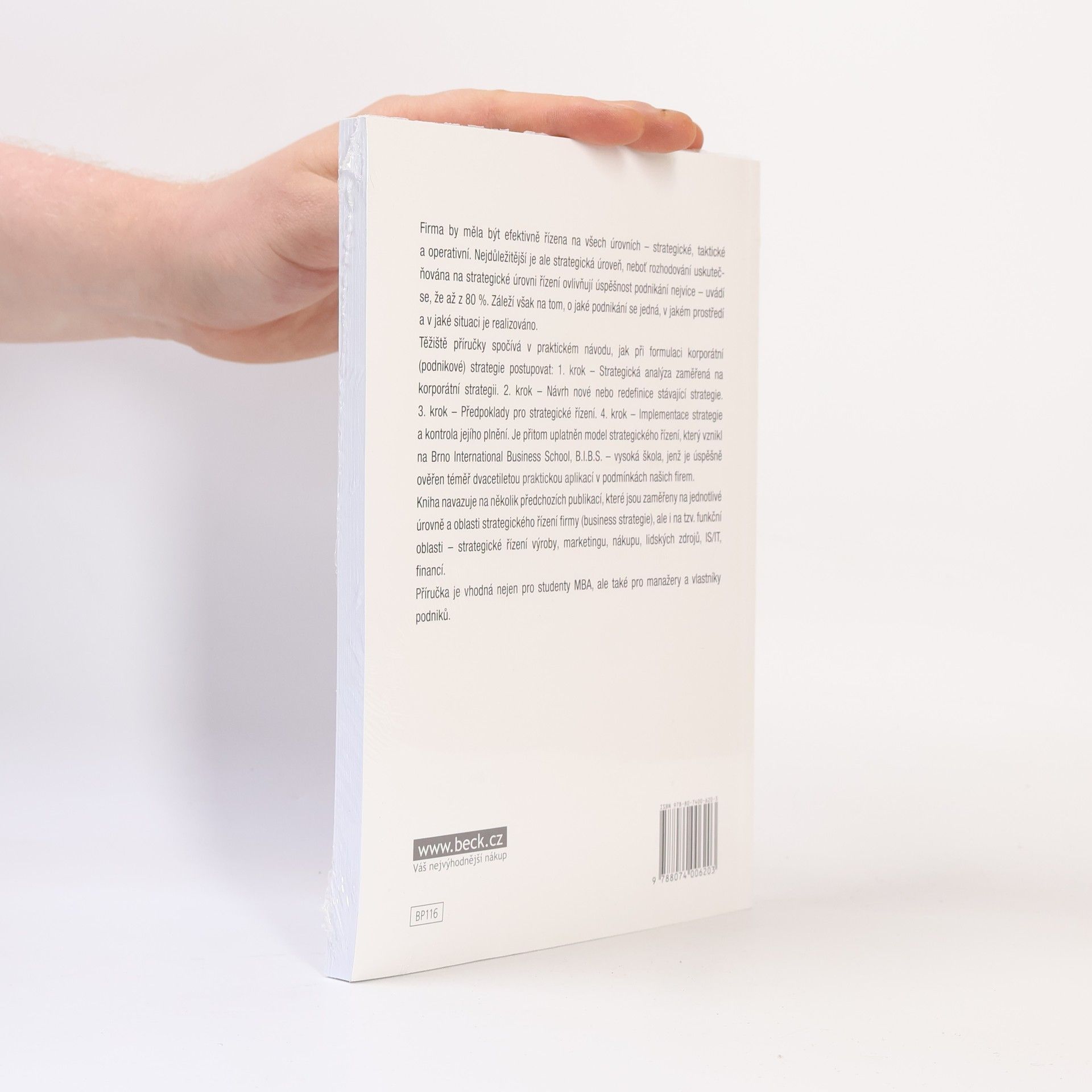 Firma by měla být efektivně řízena na všech úrovních - strategické, taktické a operativní. Nejdůležitější je ale strategická úroveň, neboť rozhodování uskutečňována na strategické úrovni řízení ovlivňují úspěšnost podnikání nejvíce - uvádí se, že až z 80 %. Záleží však na tom, o jaké podnikání se jedná, v jakém prostředí a v jaké situaci je realizováno. Myšlenkovým těžištěm řešení strategie nejvyšší úrovně, tzv. korporátní strategie, je v této publikaci model strategického řízení, který vznikl na Brno International Business School B.I.B.S. - vysoká škola na základě studia nejdůležitějších publikací západního strategického managementu a jenž je úspěšně ověřen dnes již téměř dvacetiletou praktickou aplikací v podmínkách našich firem. Příručka přináší praktický návod, jak při formulaci korporátní (podnikové) strategie postupovat: 1. krok - Strategická analýza zaměřená na korporátní strategii. 2. krok - Návrh nové nebo redefinice stávající strategie, 3. krok - Předpoklady pro strategické řízení, 4. krok - Implementace strategie a kontrola jejího plnění. Kniha navazuje na několik předchozích publikací, které jsou zaměřeny na jednotlivé úrovně a oblasti strategického řízení firmy (business strategie), ale i na tzv. funkční oblasti - strategické řízení výroby, marketingu, nákupu, lidských zdrojů, IS/IT a financí. Příručka je vhodná nejen pro studenty MBA, ale také pro manažery a vlastníky podniků.
