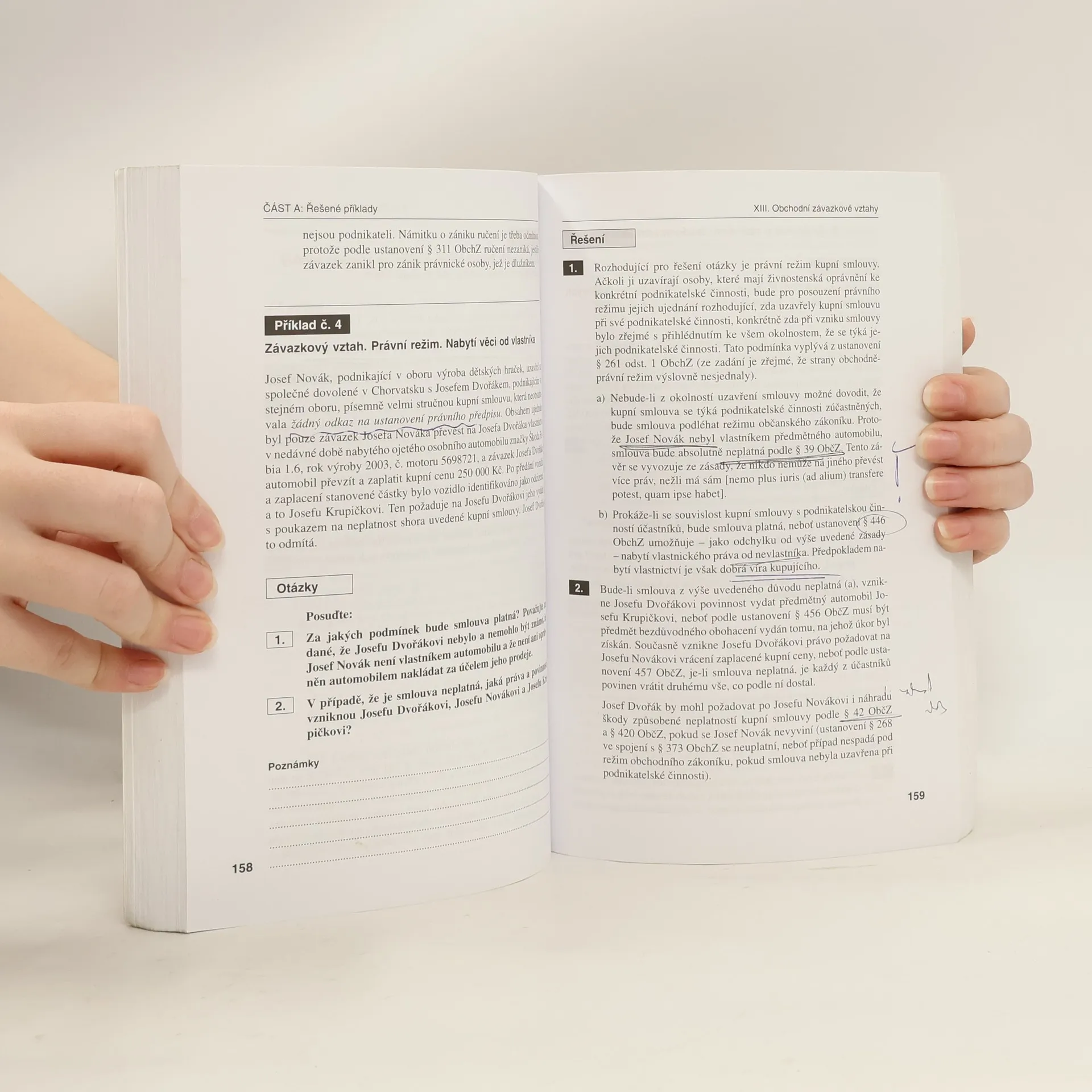 Přepracované, 4. vydání učebnice obsahuje příklady z oboru obchodního práva, jež jsou navíc všechny opatřeny i řešením. Publikace je určena především studentům k procvičování látky, s níž se seznamují na přednáškách, seminářích i studiem učebních textů či s níž se setkávají v praxi, a má pomoci k pochopení širších souvislostí jednotlivých příkladů. Odpovědi na některé položené otázky jsou proto rozpracovány do větší šíře, než jaká je požadována pro řešení příkladů při klauzurních pracích. Příklady mají vést studenty především k užití logiky, systematického i historického výkladu i přemýšlení o účelu právní normy. Proto autoři této učebnice kladou důraz na právní principy, které mají při výkladu a aplikaci konkrétní právní normy a při řešení příkladů nejen interpretační, ale často i subsidiární, případně derogační význam.