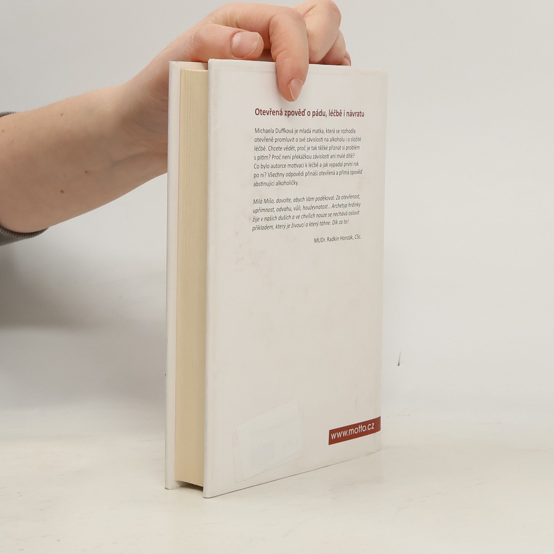 Poslední sklenička… dnes už popáté. Kniha podle blogu, který získal cenu Magnesia Litera. Michaela Duffková je mladá matka, která se rozhodla otevřeně promluvit o své závislosti na alkoholu i o složité léčbě. Chcete vědět, proč je tak těžké přiznat si problém s pitím? Proč není překážkou závislosti ani malé dítě? Co bylo autorce motivací k léčbě a jak vypadal první rok po ní? Všechny odpovědi přináší otevřená a přímá zpověď abstinující alkoholičky. Upřímně sdílená zkušenost o pádu doslova na dno vzbudila velký zájem veřejnosti, Michaela získala za svůj blog cenu Magnesia Litera a začala o závislosti veřejně přednášet. Dnes se věnuje svému vysněnému projektu – centru pro prevenci a léčbu závislosti na alkoholu. „Příběh Míši Duffkové je skvělým příspěvkem k destigmatizaci ženského alkoholismu a současně unikátní výpovědí o bolesti i naději.“ prof. PhDr. Michal Miovský, Ph.D. přednosta Kliniky adiktologie 1. LF UK a VFN