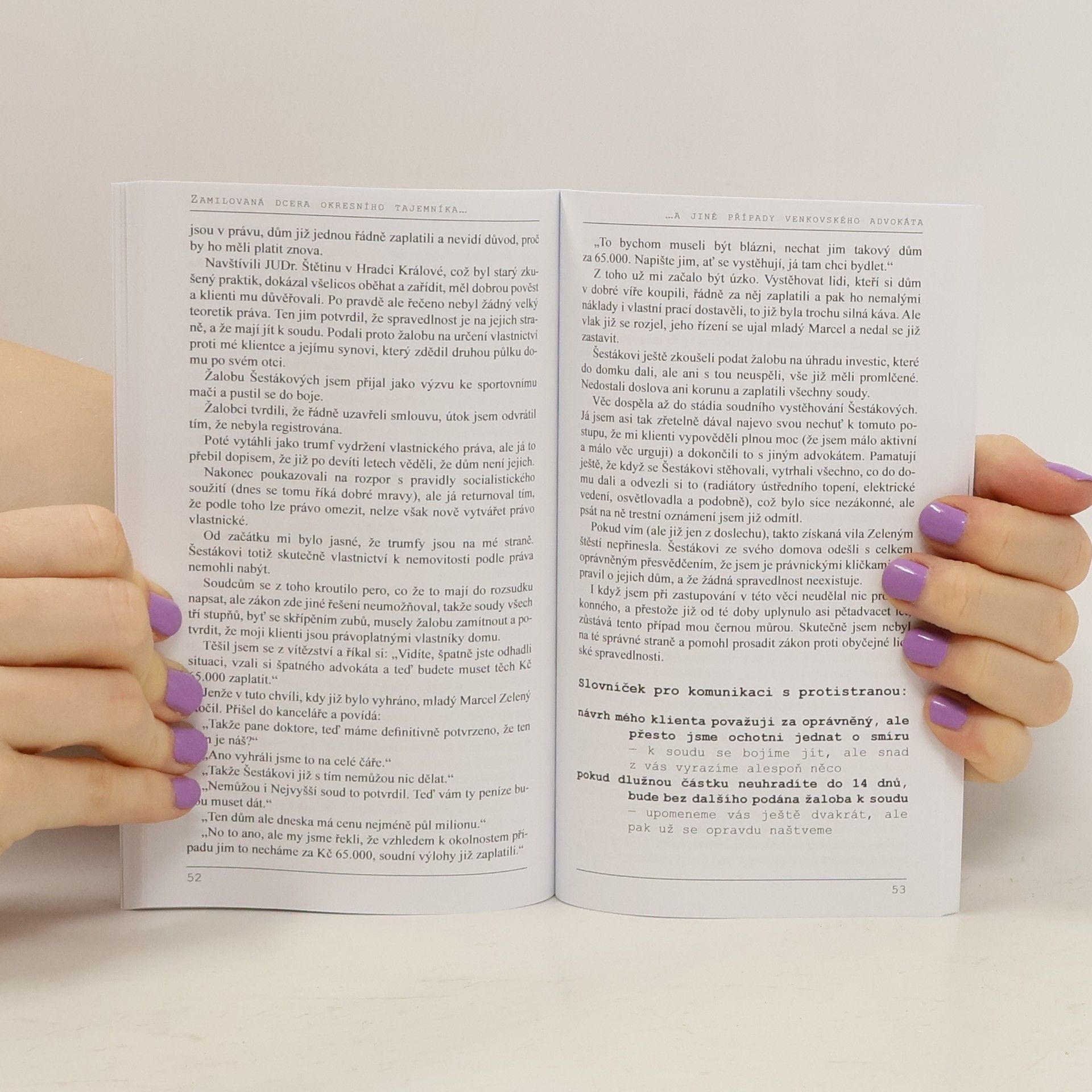Sbírka nesmírně humorných soudniček z časů současných i minulých je doplněna vtipnými slovníčky pro komunikaci s klienty, soudci, obviněnými i příbuznými. A protože jejím autorem je skutečný „venkovský“ advokát, vedle legrace v ní samozřejmě nechybí ani nadhled a životní moudrost zkušeného člověka, který strávil mnoho let v luzích a hájích českého práva a spravedlnosti.
