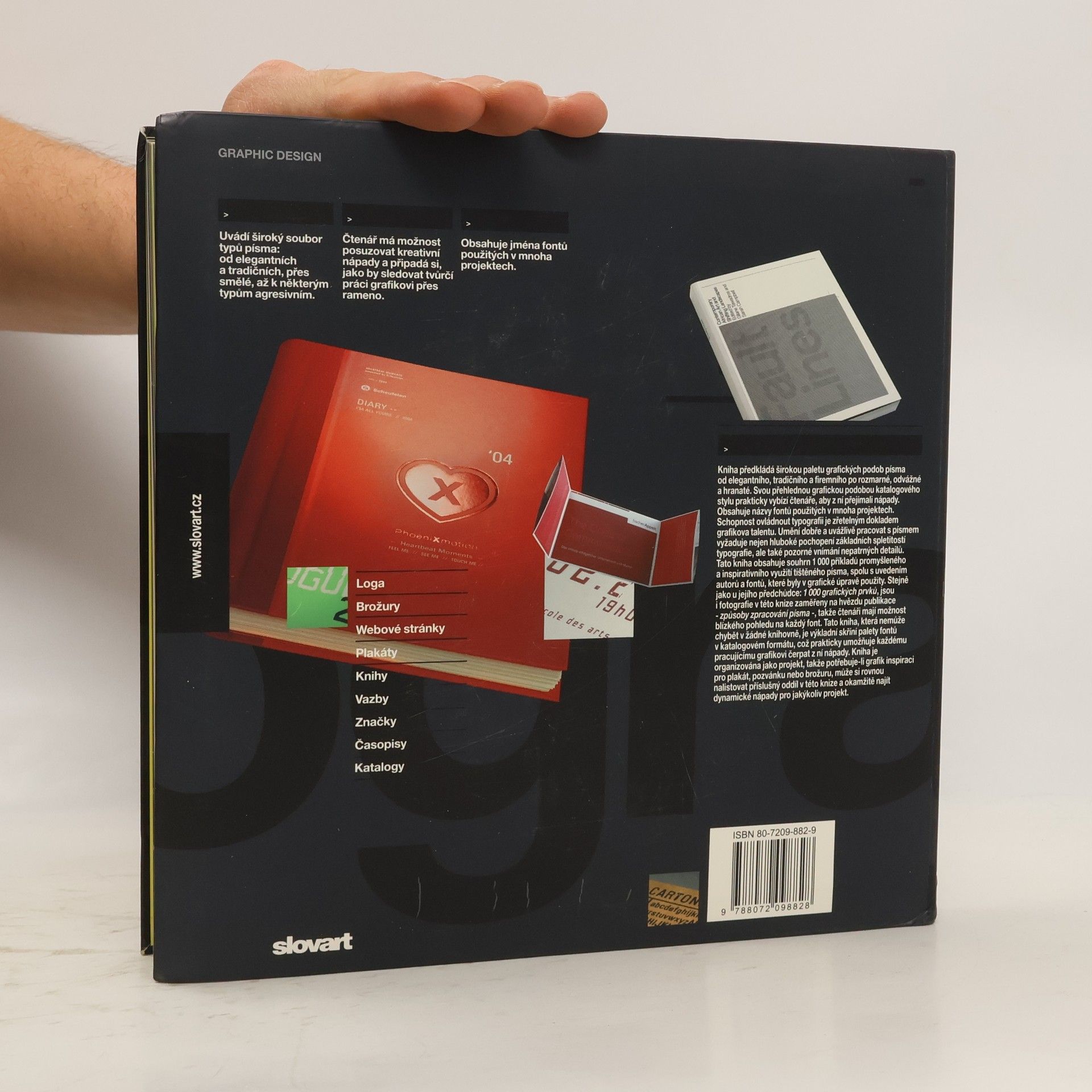 Široká paleta grafických podob písma od elegantního, tradičního a firemního po rozmarné, odvážné a hranaté. Přehledná grafická podoba katalogového stylu vybízí čtenáře k přejímání nápadů z knihy. Obsahuje dále názvy fontů použitých v mnoha projektech i souhrn 1000 příkladů promyšleného a inspirativního využití tištěného písma, spolu s uvedením autorů a fontů, které byly v grafické úpravě využity. Ideální pomůcka - potřebuje-li grafik inspiraci pro plakát, pozvánku nebo brožuru, může si rovnou nalistovat příslušný oddíl v této knize a okamžitě najít dynamické nápady pro konkrétní projekt.