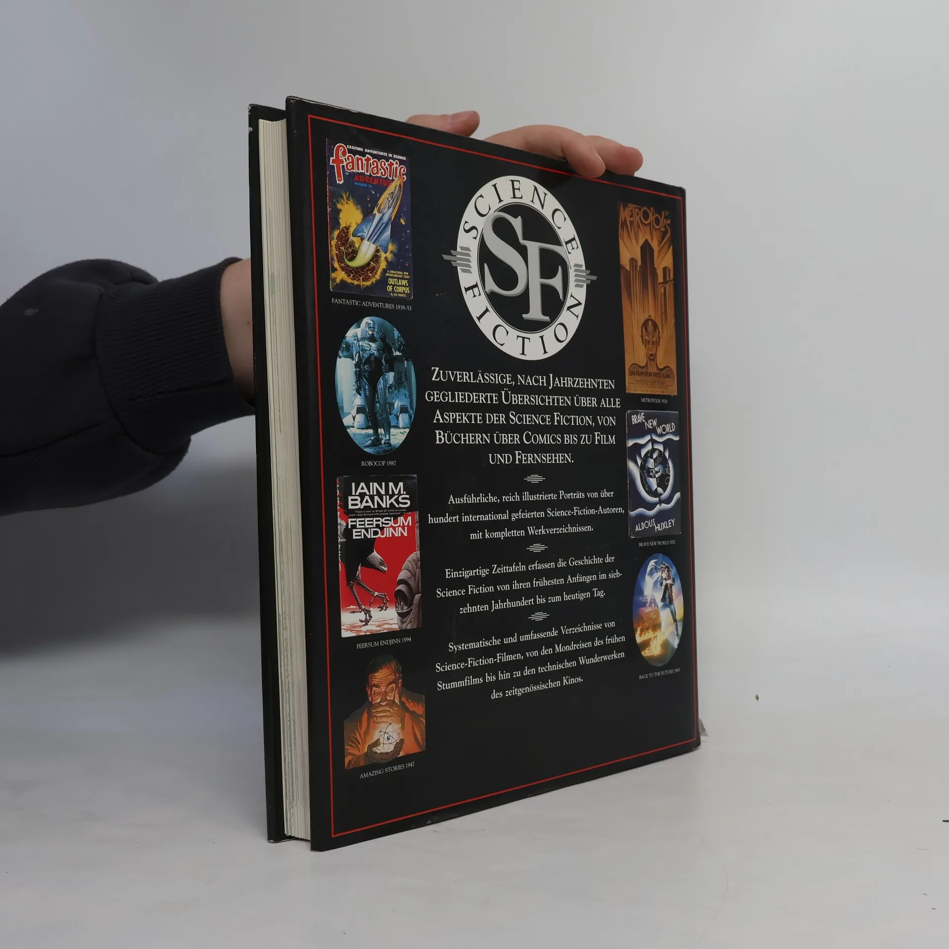 Opulentes, reich ausgestattetes Werk, das einen umfassenden Einblick in das Science-fiction-Genre vom 18. Jahrhundert bis heute bietet. Die Schilderung utopischer Visionen und der historische Kontext (Themen und Zeittafeln) stehen am Anfang, die Literatur (Magazine, wichtige Autoren und ihre Werke, klassische Titel, graphische Werke) bilden den Hauptteil, am Schluß stehen Kino und Fernsehen. Für ein übersichtliches Konzept und kenntnisreiche, sehr informative Texte bzw. Bildlegenden sorgte der renommierte englische Journalist Clute (immerhin seit über 30 Jahren mit SF beschäftigt), für die Qualität der zahlreichen aussagekräftigen Illustrationen bürgt der Name Dorling Kindersley. Auch wenn die deutsche SF-Szene kaum zu existieren scheint (dafür gibt es das wesentlich trockenere 'Lexikon der Science-fiction-Literatur', zuletzt BA 7/88), kann dieses in jeder Hinsicht anschauliche, auch exzellent aufgemachte Werk (das seinen Preis wert ist) für alle empfohlen werden. (1).