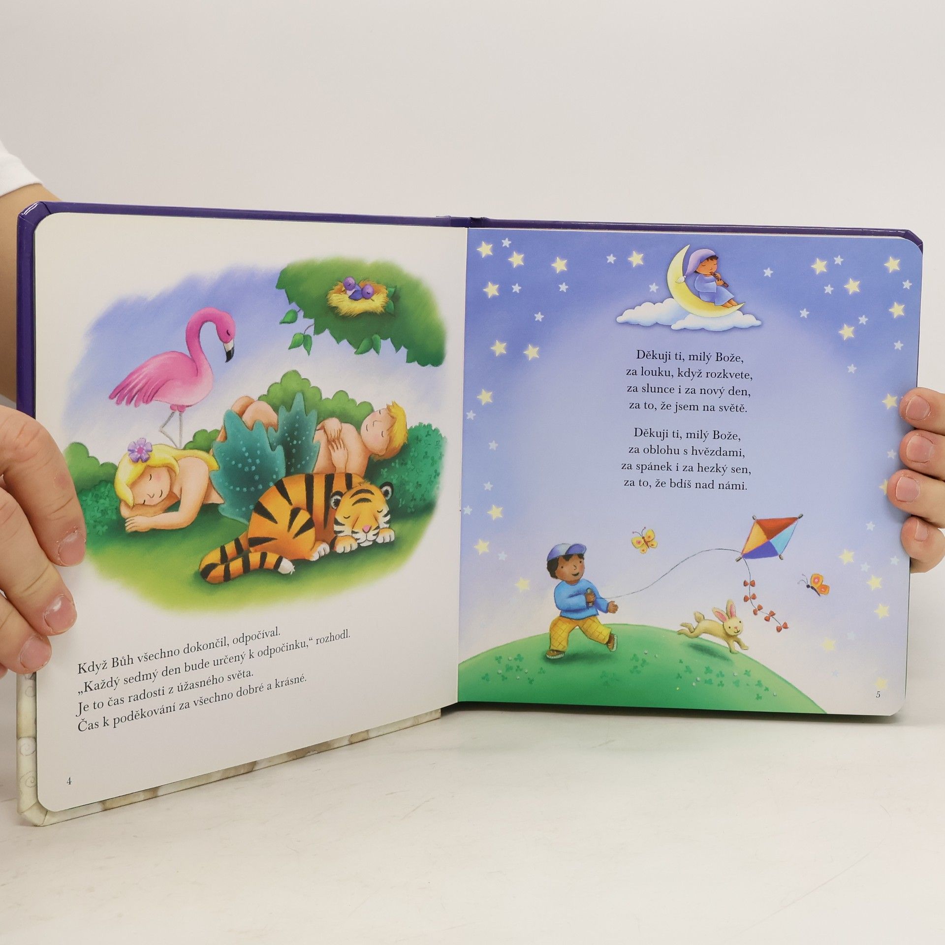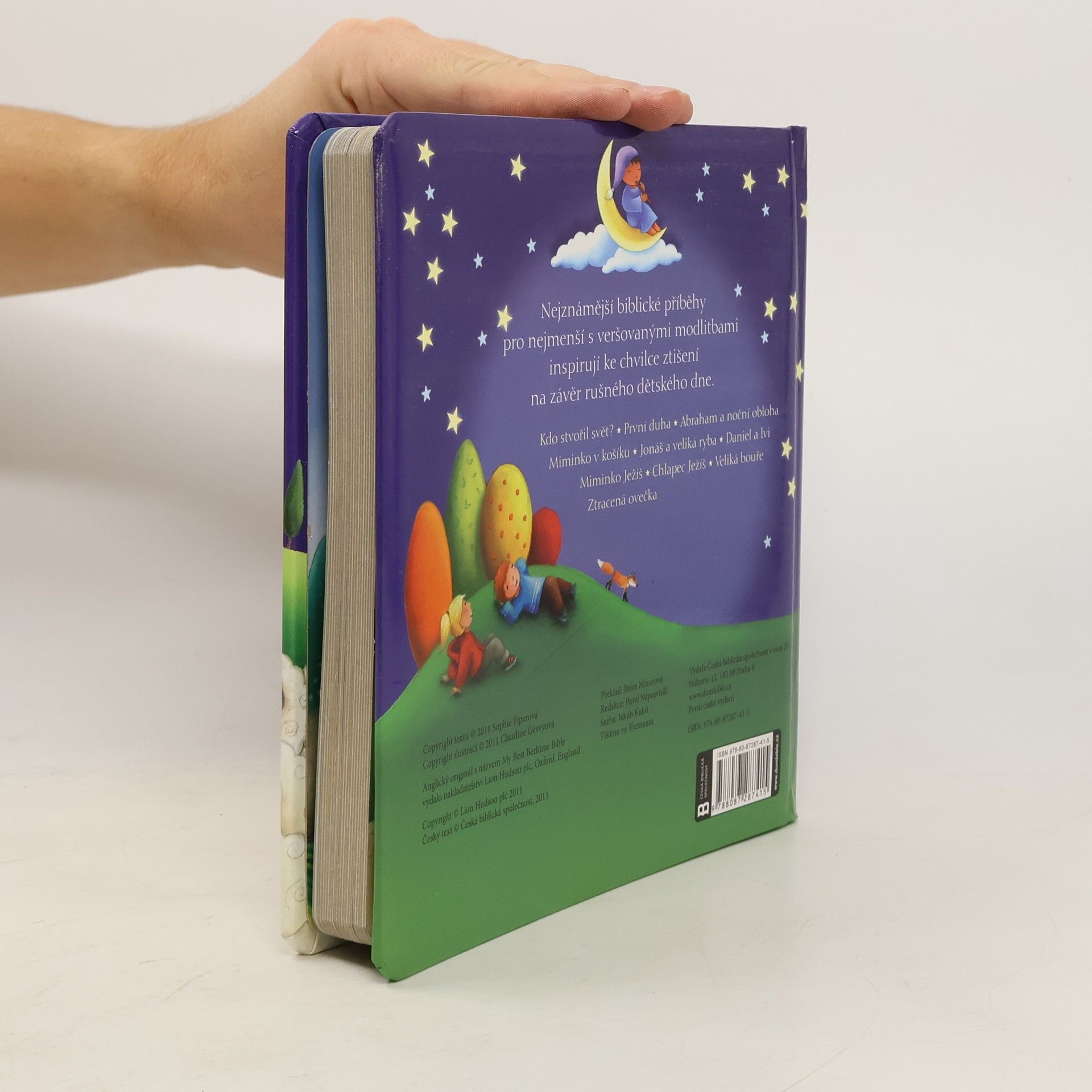 S modlitbami pro chvíle před spaním. Nejznámější biblické příběhy pro nejmenší s veršovanými modlitbami inspirují ke chvilce ztišení na závěr rušného dětského dne. Kniha s pestrými barevnými ilustracemi obsahuje vyprávění ze Starého i Nového zákona: Kdo stvořil svět? První duha. Abraham a noční obloha. Miminko v košíku. Jonáš a veliká ryba. Daniel a lvi. Miminko Ježíš. Chlapec Ježíš. Veliká bouře. Ztracená ovečka.