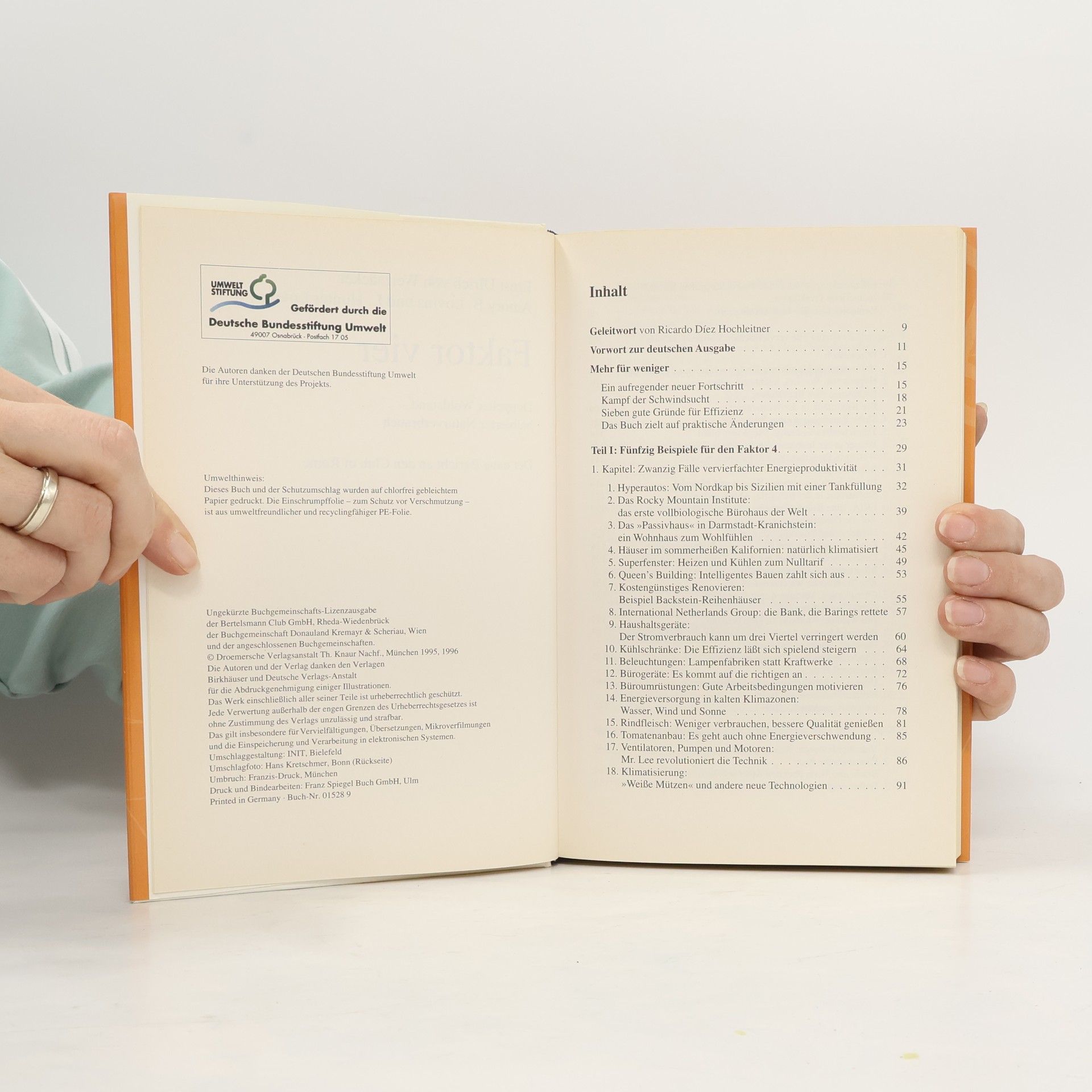 Das Know-how für eine neue umweltschonende Wachstumspolitik ist vorhanden. Wir können heute Solarhäuser bauen, deren Energiekosten fast bei Null liegen, oder Supersparautos, die nicht nur sparsam und sicher, sondern auch komfortabel sind. Der Umweltschutz, von der Wirtschaft immer als Kostenfaktor gefürchtet, ist längst dabei, zum Nutzenfaktor zu werden. Die Autoren machen sich für eine Effizienzrevolution stark, die dazu führen soll, daß wir die Naturgüter mindestens viermal besser nutzen als bisher. Das ist allerdings nur mit Unterstützung der Politik möglich, die endlich aufhören muß, Vergeudung zu subventionieren, und sich zu einer ökologischen Steuerreform entschließen sollte.