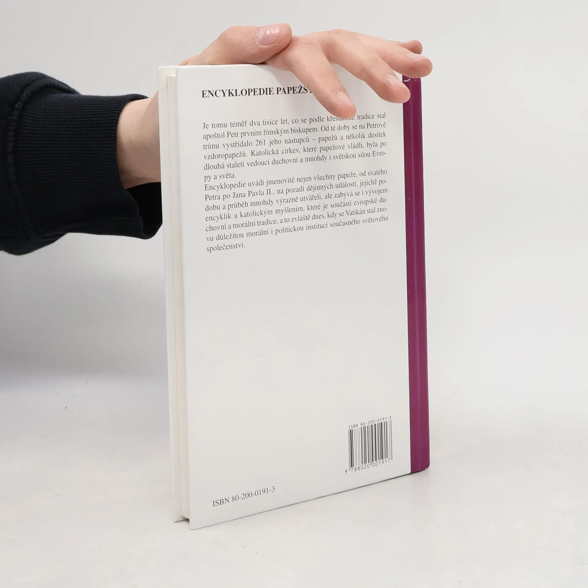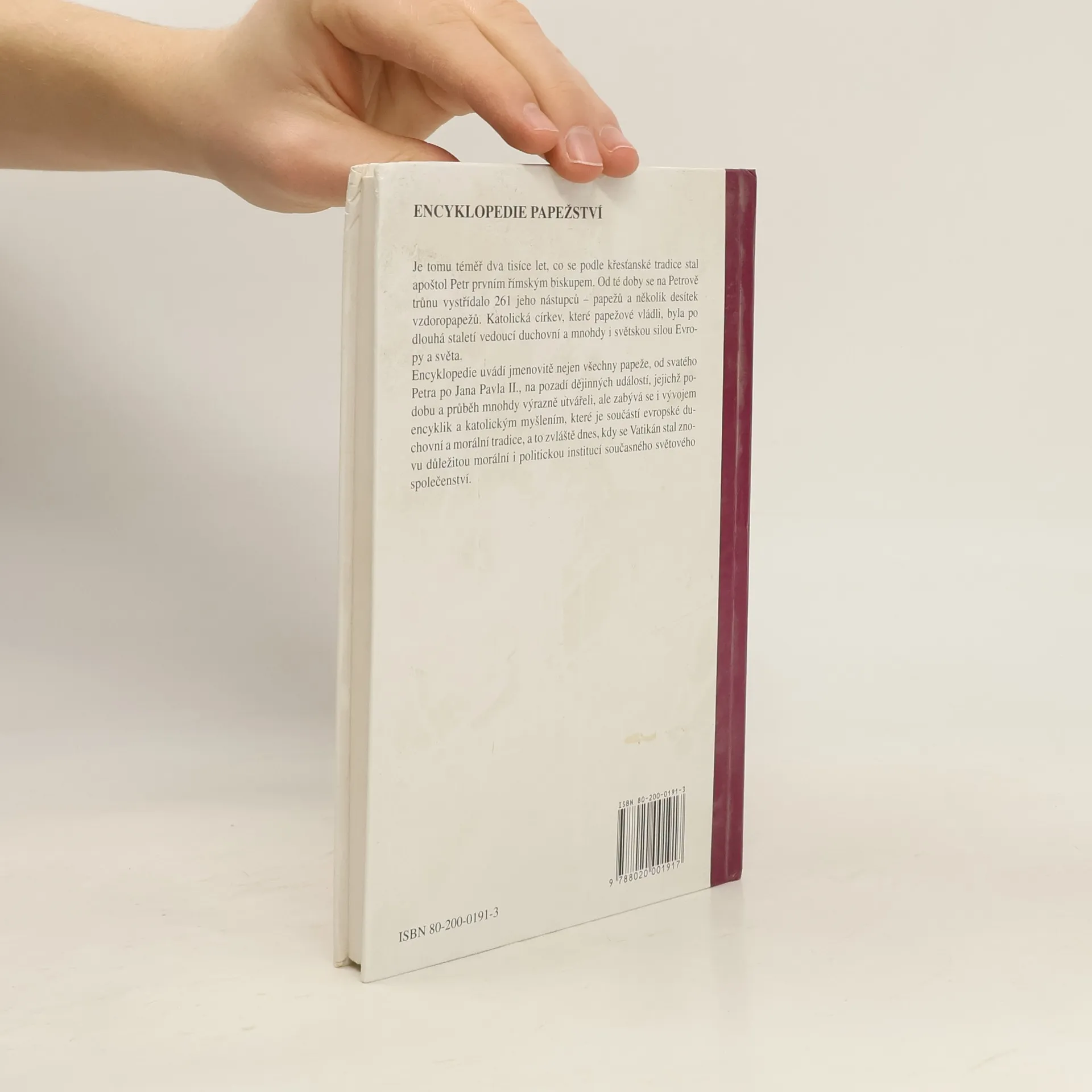 Je tomu téměř dva tisíce let, co se podle křesťanské tradice stal apoštol Petr prvním římským biskupem. Od té doby se na jeho trůnu vystřídalo 261 jeho nástupců – papežů a několik desítek vzdoropapežů. Katolická církev, které papežové vládli, byla po dlouhá staletí vedoucí duchovní a mnohdy i světskou silou Evropy a světa. Encyklopedie uvádí jmenovitě nejen všechny papeže od svatého Petra po Jana Pavla II., na pozadí dějinných událostí, jejichž podobu a průběh mnohdy výrazně utvářeli, ale zabývá se i vývojem encyklik a katolickým myšlením, které je součástí evropské duchovní a morální tradice, a to zvláště dnes, kdy se Vatikán stal znovu důležitou morální i politickou institucí současného světového společenství. (cbdb, uživatel Shaman)