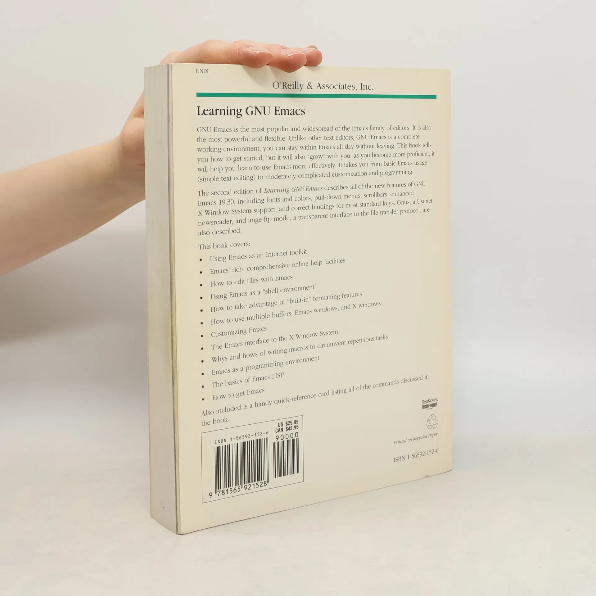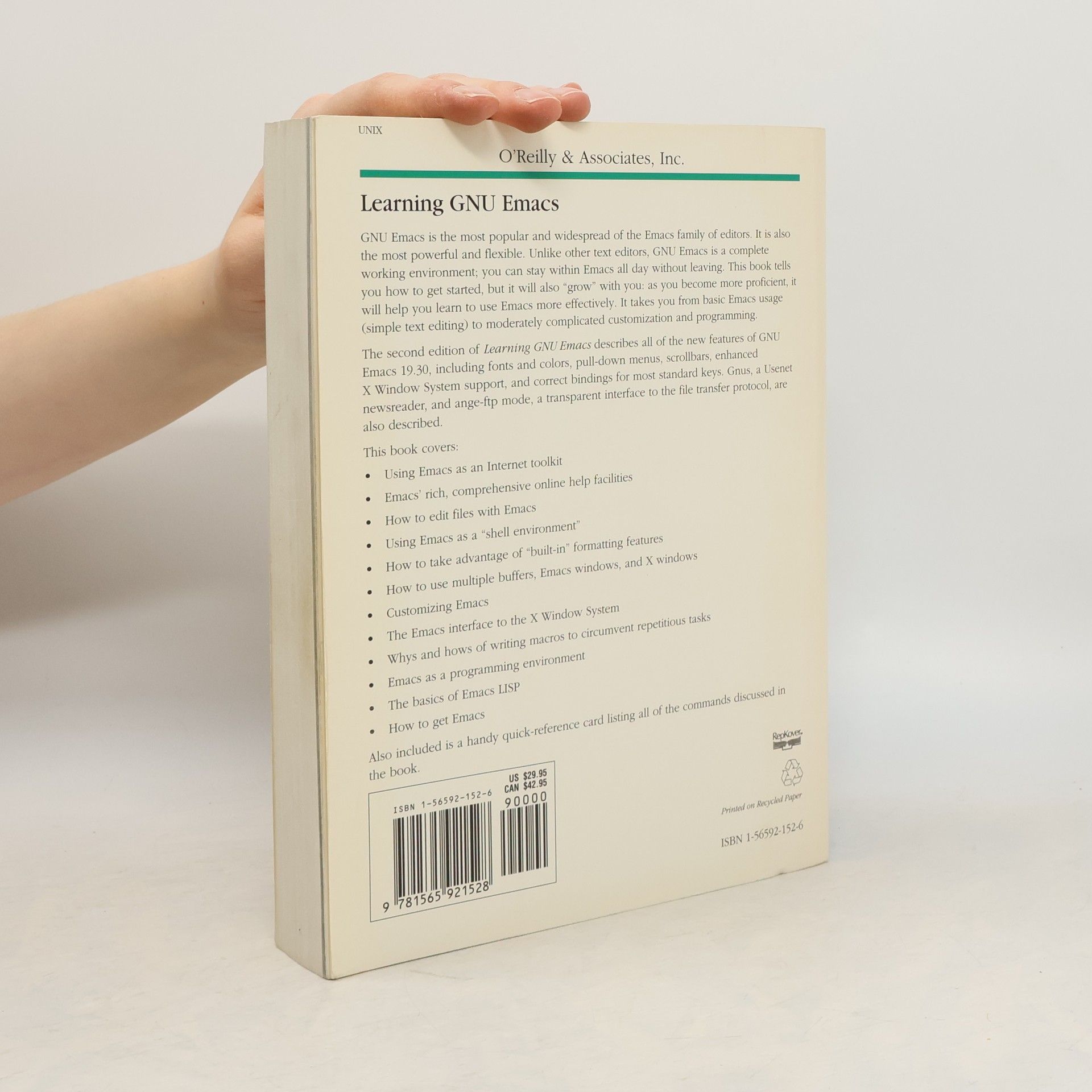 GNU Emacs is the most popular and widespread of the Emacs family of editors. It is also the most powerful and flexible. Unlike all other text editors, GNU Emacs is a complete working environment -- you can stay within Emacs all day without leaving. This book tells you how to get started with the GNU Emacs editor. It will also "grow" with as you become more proficient, this book will help you learn how to use Emacs more effectively. It takes you from basic Emacs usage (simple text editing) to moderately complicated customization and programming.The second edition of Learning GNU Emacs describes all of the new features of GNU Emacs 19.30, including fonts and colors, pull-down menus, scroll bars, enhanced X Window support, and correct bindings for most standard keys. GNUS, a Usenet newsreader, and ange-ftp mode, a transparent interface to the file transfer protocol, are also described. Learning GNU Emacs , second edition, The book is aimed at new Emacs users, whether or not they are programmers. Also useful for readers switching from other Emacs implementations to GNU Emacs.