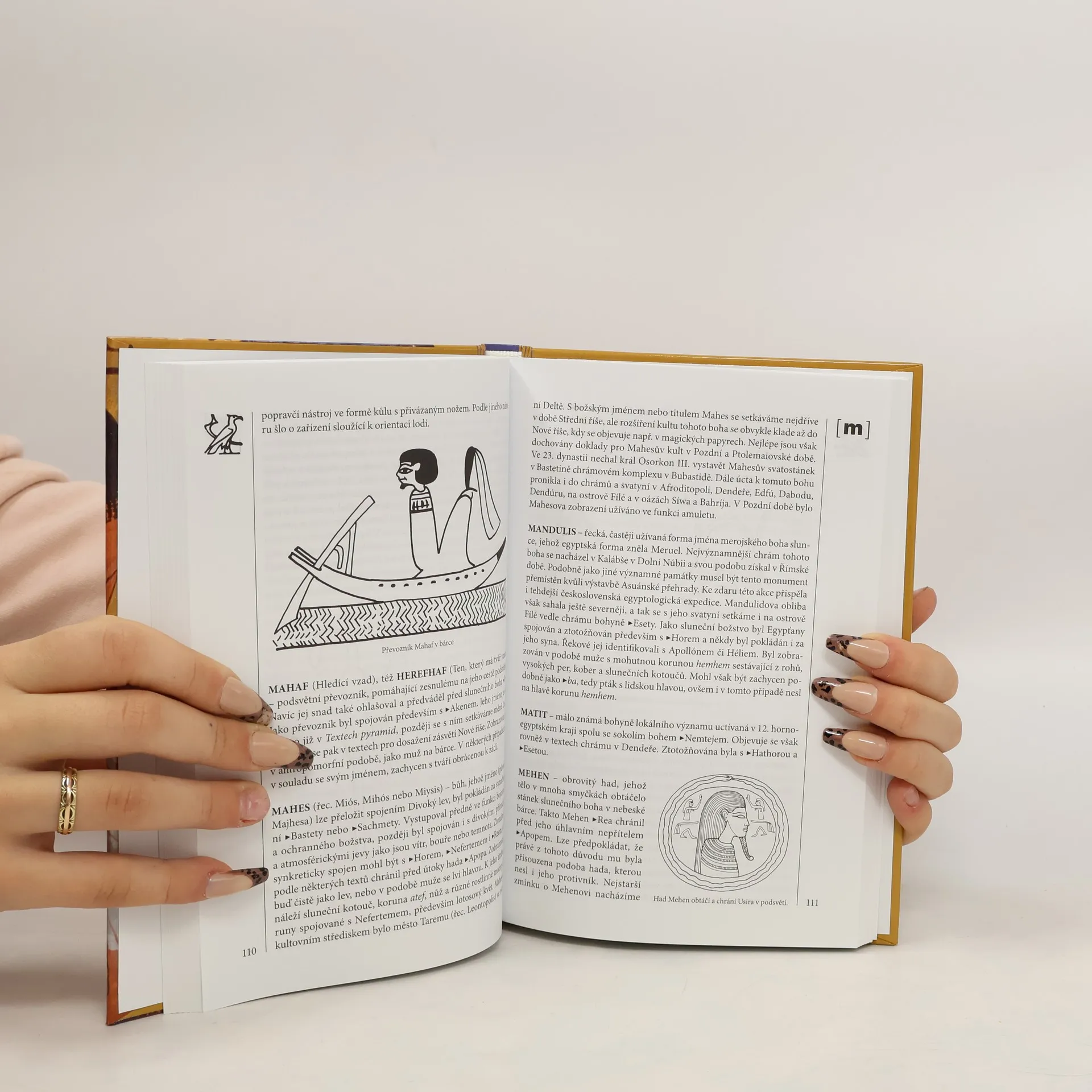 Autor, egyptolog a religionista, v úvodní přehledné stati a následujících heslech popisuje barvitý a pro nás značně exotický svět egyptských bohů a mýtů v jejich tisíciletých proměnách, v návaznosti na jednotlivé lokality i na egyptské dějiny, a ohlasy v architektuře, malířství, plastice i divadle, a to až do období helénismu. Abecedně řazený, esejisticky pojatý slovník provází mnoho vyobrazení.
