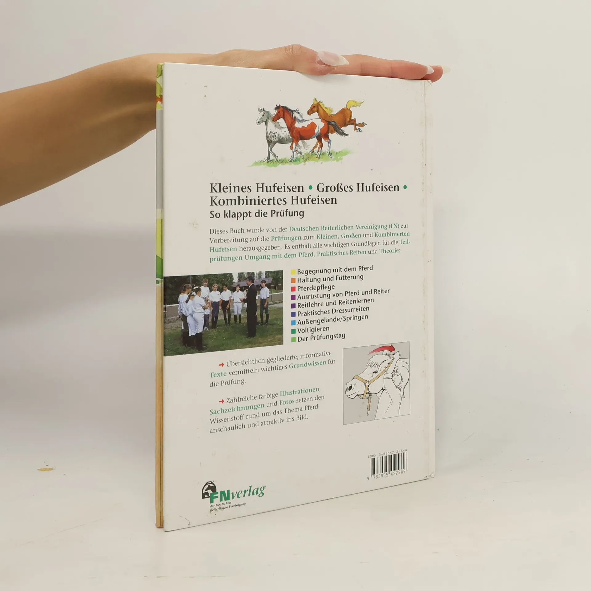 Das „Kleine Hufeisen“, ein Abzeichen der Deutschen Reiterlichen Vereinigung (FN), erfreut sich bei Kindern großer Beliebtheit: jedes Jahr werden rund 20.000 Prüfungen abgelegt. Dieses Sachbuch für Kinder ver-mittelt auf attraktive, interessante Weise den gesamten Wissensstoff für das „Kleine Hufeisen“, einschließlich der alternativ möglichen Teilprüfung Voltigieren und der Aufbauprüfung „Das große Hufeisen“. Für die sachliche Richtigkeit bürgt die Deutsche Reiterliche Vereinigung als Herausgeber. Es geht um Pferdehaltung und -pflege, den Umgang mit dem Pferd und der Reitausrüstung, die Anforderungen im praktischen Reiten und den Ablauf der Prüfung. Aktualisiert nach APO 2010.
