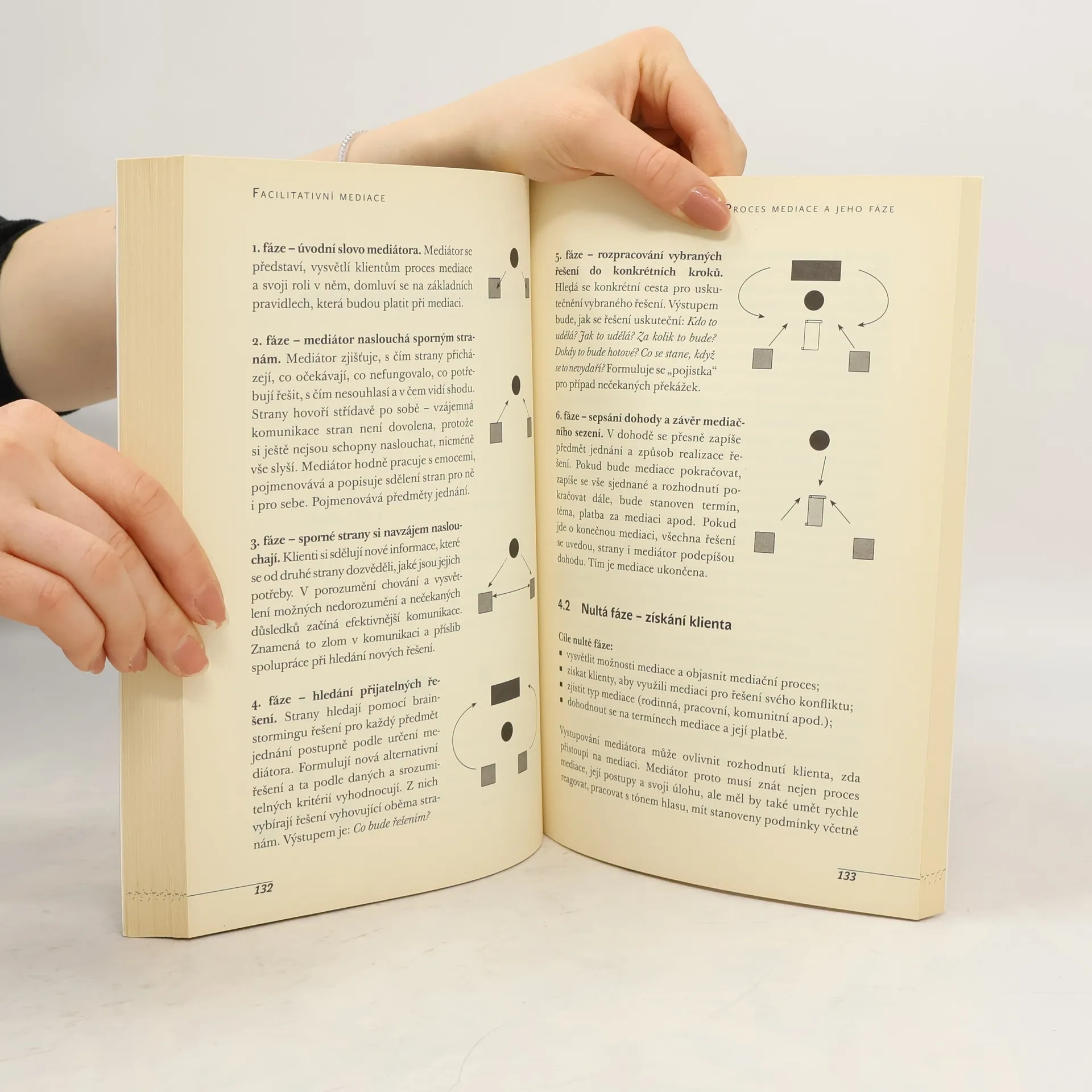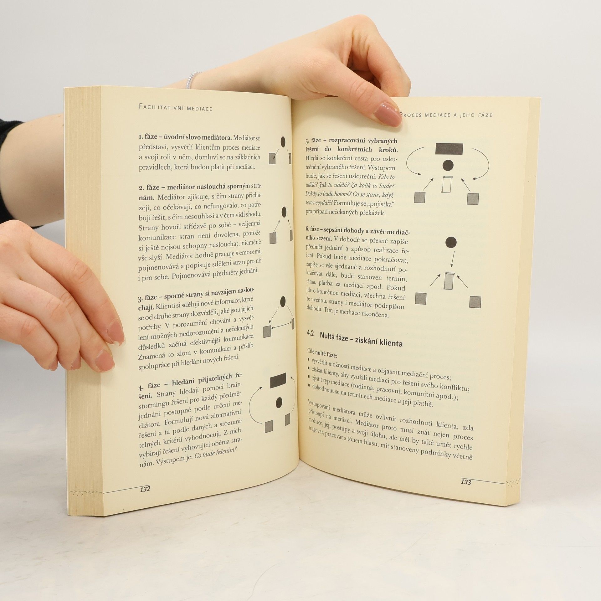 V knize jsou nejdříve uvedeny stručné informace z historie mediace ve světě a v ČR z pohledu školitele a realizátora rodinné, komunitní a pracovní mediace. Další text se zabývá definicí mediace, jejími specifiky, informacemi o rozdílech mezi trendy mediace ve světě, tj. mezi mediací facilitativní, evaluativní a transformativní, a poukazuje na základní rámce, které je vymezuji – komunikace a konflikt. Samostatné kapitoly se věnují definování role mediátora i jeho základním dovednostem a podrobně procesu facilitativní mediace. Cvičení, příklady a ukázky z praxe prokládají text. Součástí textu je slovníček, vzory dohod, přehled použité a doporučené literatury.
